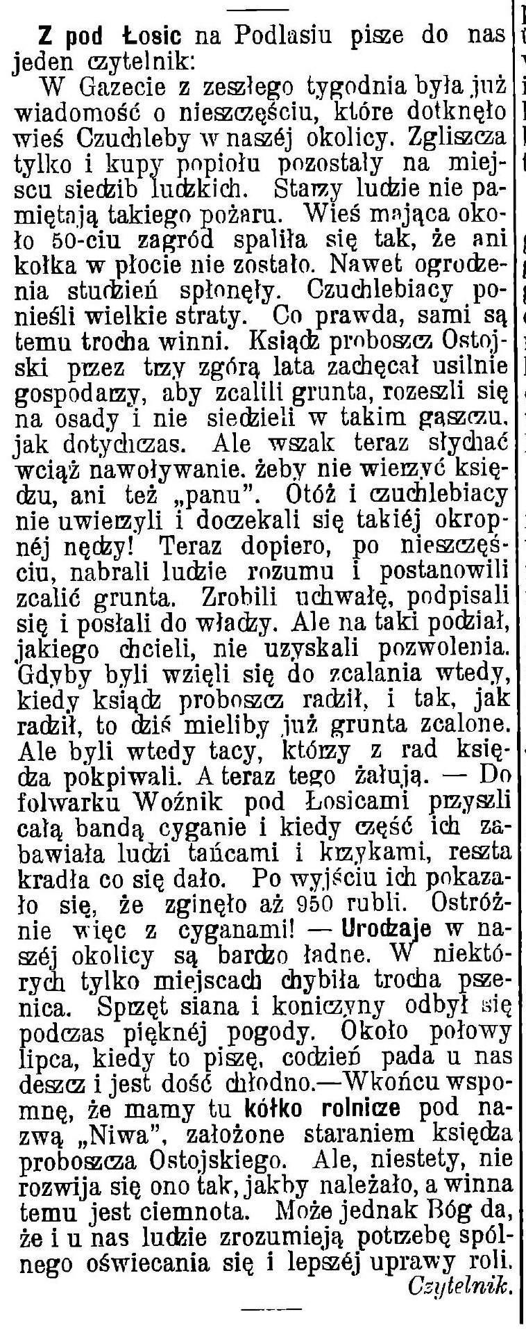 Z pod Łosic na Podlasiu pisze do nas jeden czytelnik: W Gazecie z zeszłego tygodnia była już wiadomość o nieszczęściu, które dotknęło wieś Czuchleby w naszej okolicy. Zgliszcza tylko i kupy popiołu pozostały na miejscu siedzib ludzkich. Starzy ludzie nie pamiętają takiego pożaru. Wieś mająca około 50-ciu zagród spaliła się tak, że ani kołka w płocie nie zostało. Nawet ogrodzenia studzień spłonęły. Czuchlebiacy ponieśli wielkie straty. Co prawda, sami są temu trocha winni. Ksiądz proboszcz Ostojski przez trzy zgórą lata zachęcał usilnie gospodarzy, aby zcalili grunta, rozeszli się na osady i nie siedzieli w takim gąszczu, jak dotychczas. Ale wszak teraz słychać wciąż nawoływanie. żeby nie wierzyć księdzu, ani też „panu".