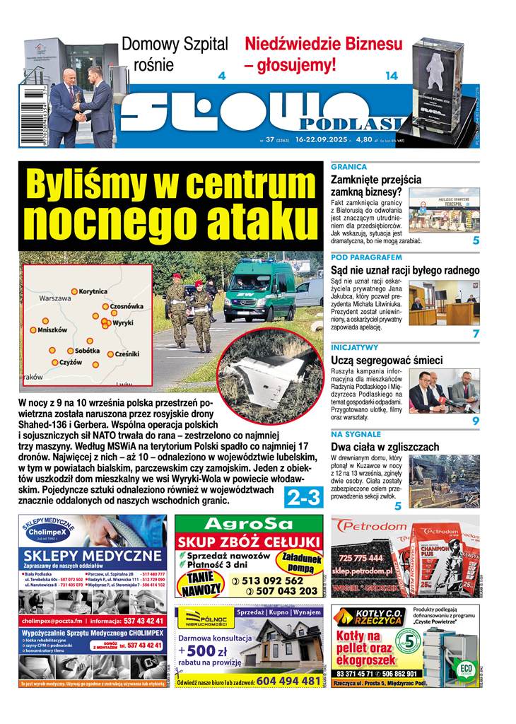 - Byliśmy w centrum nocnego ataku. W nocy z 9 na 10 września polska przestrzeń powietrzna została naruszona przez rosyjskie drony Shahed-136 i Gerbera. Wspólna operacja polskich i sojuszniczych sił NATO trwała do rana – zestrzelono co najmniej trzy maszyny. Według MSWiA na terytorium Polski spadło co najmniej 17 dronów. Najwięcej z nich – aż 10 – odnaleziono w województwie lubelskim, w tym w powiatach bialskim, parczewskim czy zamojskim. Jeden z obiektów uszkodził dom mieszkalny we wsi Wyryki-Wola w powiecie włodawskim. Pojedyncze sztuki odnaleziono również w województwach znacznie oddalonych od naszych wschodnich granic.