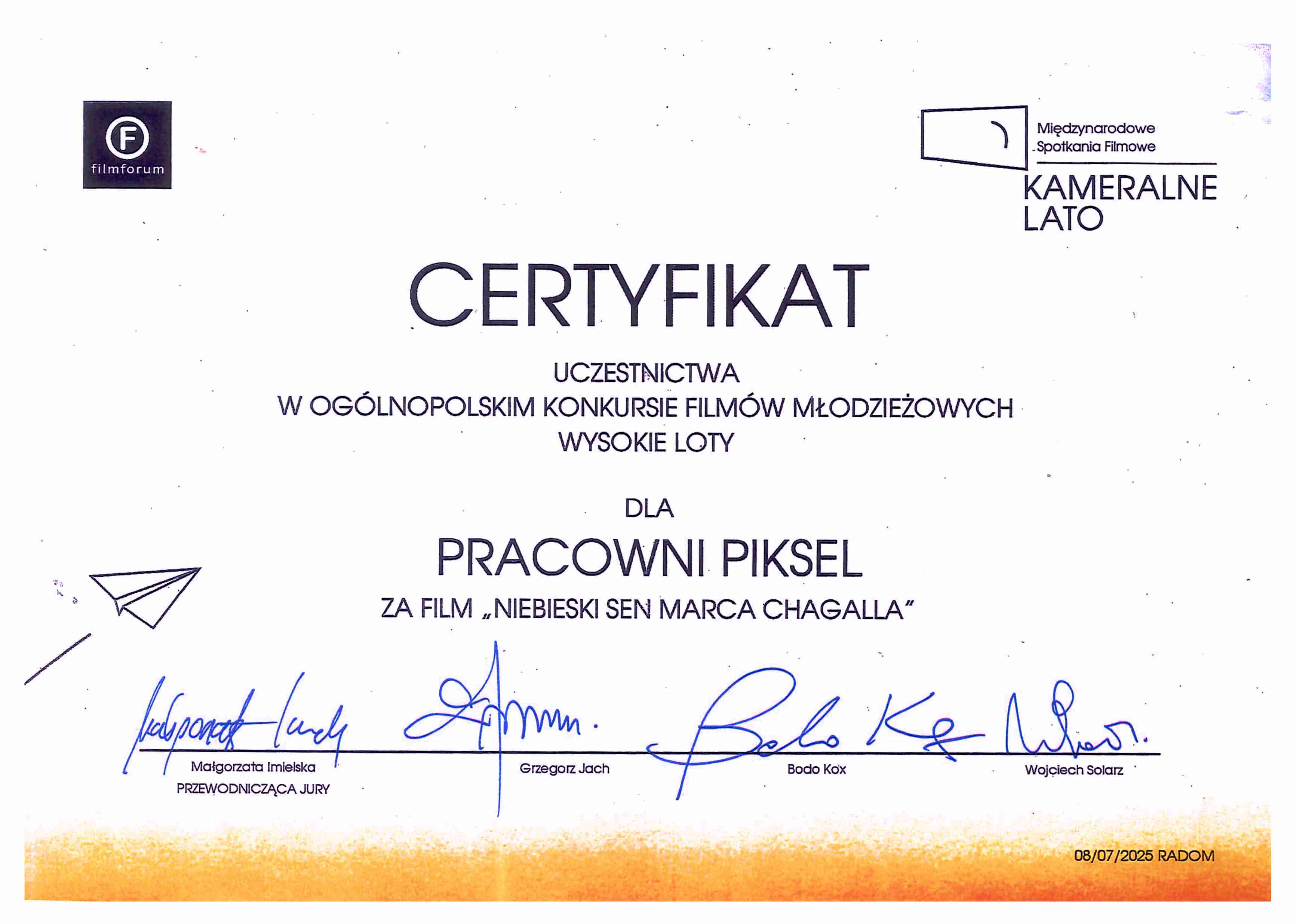 Młodzi twórcy z Pracowni Grafiki Komputerowej „Piksel” działającej przy Bialskim Centrum Kultury po raz kolejny udowodnili, że talent i pasja nie znają barier wiekowych. Ich animacja „Niebieski sen Marca Chagalla” została doceniona przez profesjonalne jury i zakwalifikowała się do finału prestiżowego Ogólnopolskiego Konkursu Filmów Młodzieżowych „WYSOKIE LOTY” w ramach 18. edycji Międzynarodowych Spotkań Filmowych Kameralne Lato w Radomiu. Twórcami nagrodzonej animacji są: Pola Kopytiuk, Lidia Sacharuk, Helena Sacharuk, Natalia Grzechnik, Adam Huczek, Ignacy Aduckiewicz, Władysław Misiołek, Wiktor Skoczeń, Marta Lesińska, Lilianna Rudzka, Zuzanna Rudzka, Paulina Borowska, Aleksander Wapa, Zuzanna Jóźwik, Dorota Wawryniuk, Sebastian Kordaczuk, Jakub Kordaczuk, Marcelina Niedźwiedź, Emilia Daniluk, Łucja Reluga oraz Anna Chomińska. Młodzi twórcy z Białej Podlaskiej, reprezentowani na festiwalu przez siostry Liliannę i Zuzannę Rudzką, rywalizowali z uczniami liceów plastycznych oraz studentami animacji z uczelni wyższych, co tylko podkreśla skalę ich sukcesu.