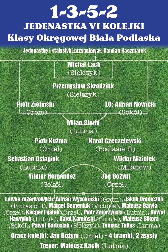 Wybrali Państwo najpopularniejszego piłkarza sierpnia w bialskopodlaskiej klasie okręgowej, głosując w ankiecie na naszej stronie internetowej. Został nim Jakub Dołęga (Absolwent), który zebrał 54.03 % oddanych głosów. Miejsce drugie wywalczył Piotr Zmorzyński (Milanów) – 32.02 %, trzecie miejsce na pudle zajął Sebastian Ostapiuk (Milanów) – 4,9 %. Piłkarze w miniony weekend rozegrali siódmą kolejkę spotkań. Liderem nadal są rezerwy Podlasia, które srogo rozprawiły się na własnym boisku z Az-Bud Komarówka Podlaska 5:2. Prowadząc już po trzynastu minutach gry 3:0. Ostre strzelanie urządziły sobie Orzeł Czemierniki pokonując 8:1 Bizon Jeleniec i LKS Milanów wygrywając w tym samym stosunku na wyjeździe z Unią Żabików. W tym drugim spotkanie padły dwie bramki bezpośrednio z rzutów rożnych. Zdobyli je Bartosz Kozłowski dla gospodarzy i Piotr Zmorzyński dla gości. Sokół Adamów wygrał w Staninie 4:0, ale mógł wyżej. Sokół dwukrotnie nie wykorzystał rzutów karnych podyktowanych przez pana Patryka Zielanta. W 65 minucie egzekwowany przez kapitana Sokoła Adamów, Jarosława Boska padł łupem bramkarza Kujawiaka Stanin, Krystiana Kęndera. W 87 minucie fatalnie przestrzelił Yilmar Hernandez. Najciekawiej zapowiadał się mecz w Szachach i tak też było. Od 11 minuty gospodarze grali w dziesiątkę. Czerwoną kartkę ujrzał Eryk Kozłowski. Goście skrzętnie to wykorzystali i do przerwy prowadzili 3:0. Jak ktoś pomyślał, że to koniec emocji to się grubo pomylił. W 53 minucie siły się wyrównały za zagranie piłki ręką opuścić boisko musiał obrońca Lutni Piszczac- Jakub Kuczyński. Nadzieje w ekipie Drelowa odżyły, ale udało im się strzelić tylko dwie bramki i to Lutnia zainkasowała komplet punktów. W VII kolejce zdobyto łącznie 40 bramek co daje średnią równą liczbie 5. Sędziowie czterokrotnie wskazywali na 11 metr. Skuteczność 50% gdyż dwa karne zamieniono na bramki ( Konrad Pioruński, Milan Storto ) zaś dwie niewykorzystane zostały przez graczy z Adamowa a dokładniej przez Jarosława Boska ( obronił Krystian Kęnder ) i Yilmara Hernandeza (obok bramki).