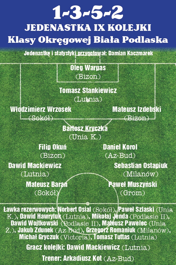 Liderem nadal są rezerwy Podlasie Biała Podlaska, które 4:1 pokonały Absolwent Domaszewnica . W pierwszej połowie spotkania rzutu karnego podyktowanego przez Mateusza Saka nie wykorzystał Konrad Pioruński z Absolwenta. Strzelił obok słupka. Unia Żabików zremisowała u siebie z Victoria Parczew 3:3. Od 68 minuty goście grali w dziesiątkę. Po dwóch żółtych kartkach Dawida Okunia dla Adriana Kozłowskiego. W 80 minucie siły się wyrównały po dwóch żółtych kartkach dla Krystiana Garbacika. Beniaminek z Drelowa uległ u siebie AZ-Bud Komarówka Podlaska 1:3. Orzeł Czemierniki przegrał u siebie z LKS Milanów 2:4 Trzy bramki zdobył Sebastian Ostapiuk. Aż dziewięć bramek oglądali kibice w Kąkolewnicy. Miejscowy Grom uległ Lutni Piszczac 3:6. Wszystkie bramki dla gospodarzy zdobył Paweł Muszyński. Dla Lutni trzy krotnie trafił Dawid Mackiewicz. W meczu na dole tabeli Stanienie miejscowy Kujawiak uległ 0:3 Bizonowi Jeleniec i przejął z rąk rywali czerwoną latarnię. W 30 minucie boisko po dwóch żółtych kartkach opuścił kapitan gości, Michał Botwina. W 75 minucie rzutu karnego dla Kujawiaka Stanin nie wykorzystał Adrian Dudkowski. Strzelił obok bramki. W Łazach miejscowy ŁKS uległ Unii Krzywda 1:3. LZS Sielczyk przegrał u siebie z Sokołem Adamów 0:3. W 29 minucie Mateusz Baran zdobył bramkę bezpośrednio z rzutu rożnego. W IX kolejce padło łącznie 40 bramek co daje średnią równą pięć bramek na mecz. Sędziowie podyktowali trzy rzuty karne z których tylko jeden (Mateusz Pawelec) został zamieniony na bramkę. Pozostałe dwa przeszły obok światła bramki (Konrad Pioruński i Adam Dudkowski).