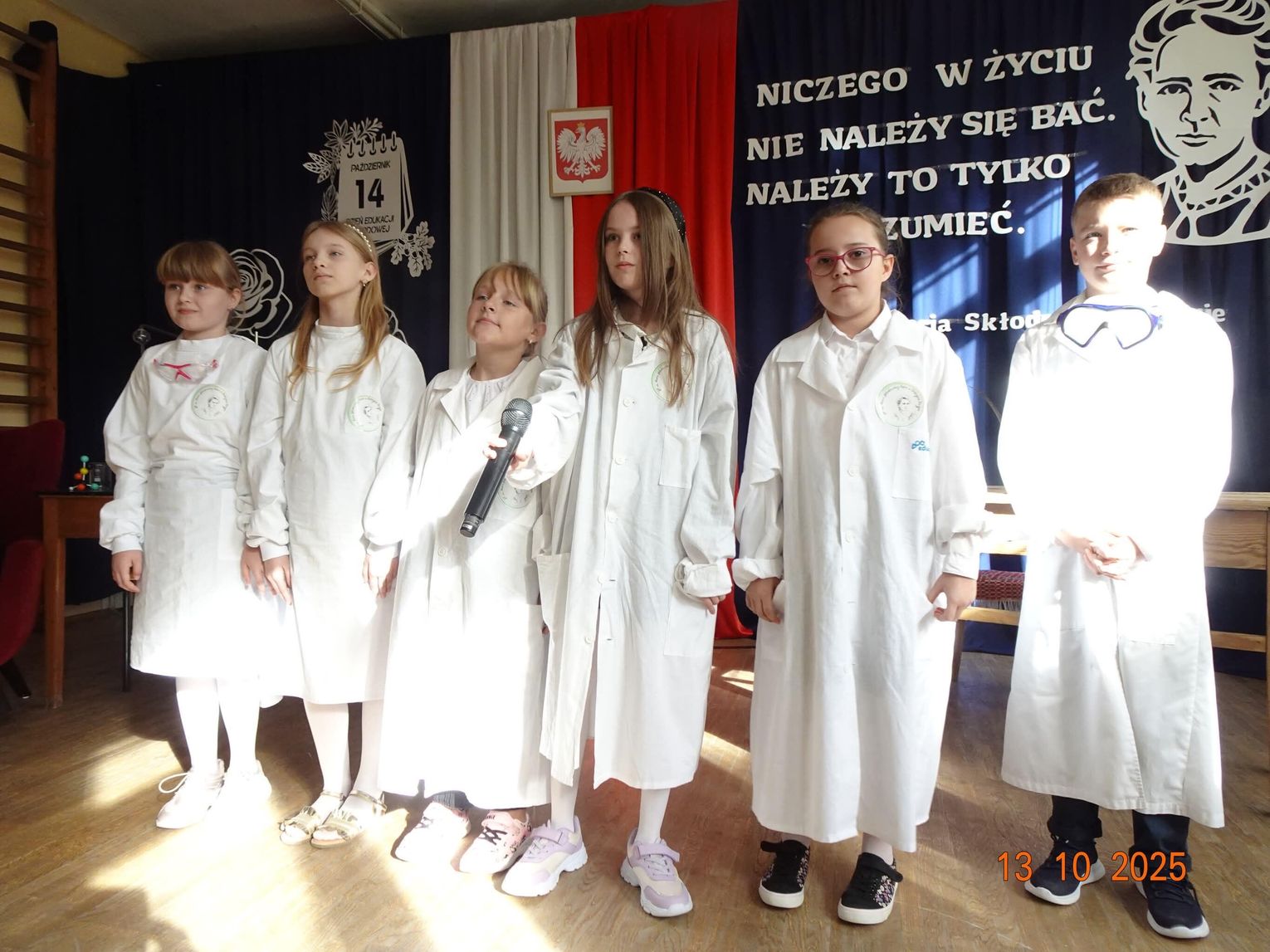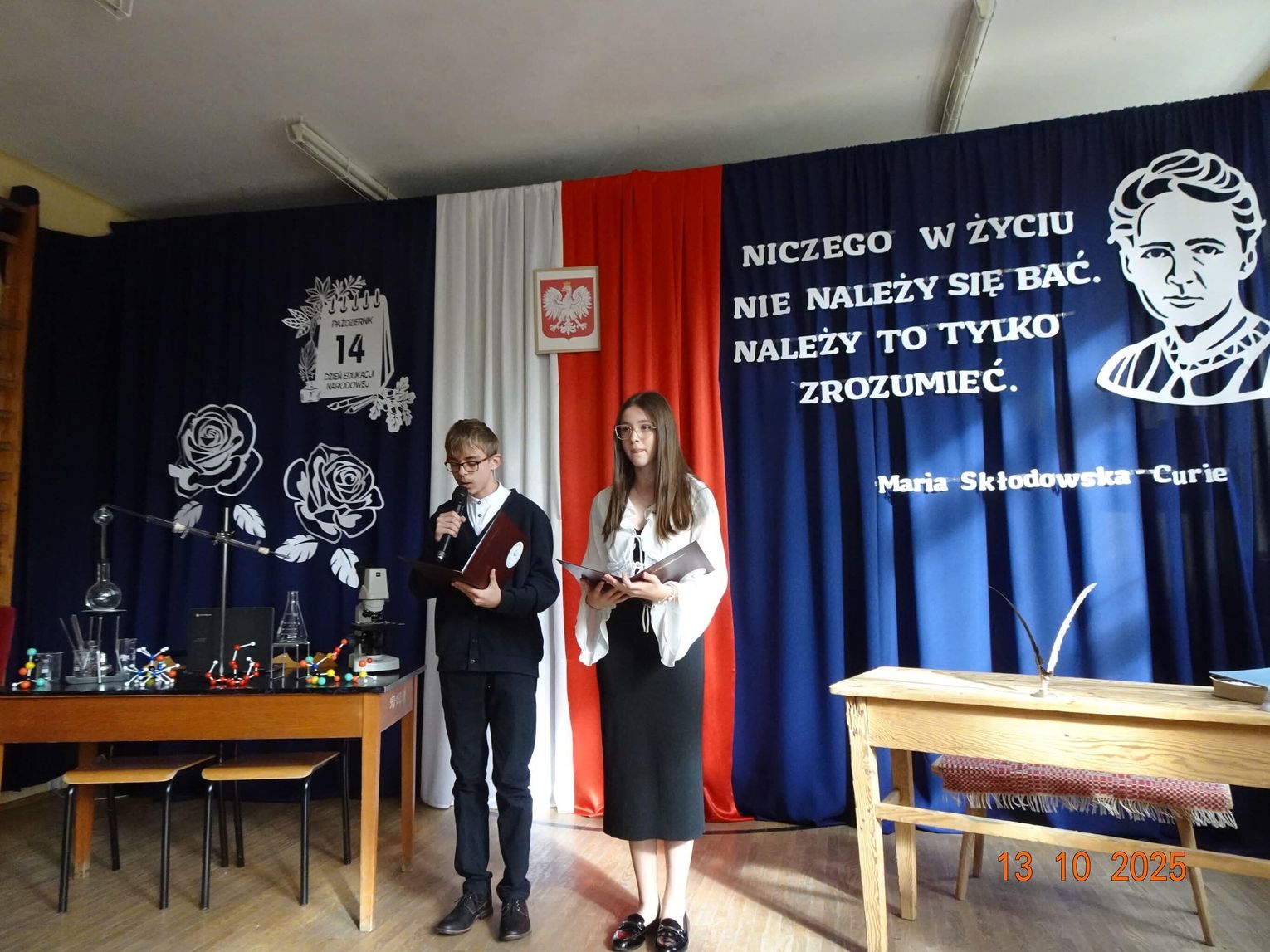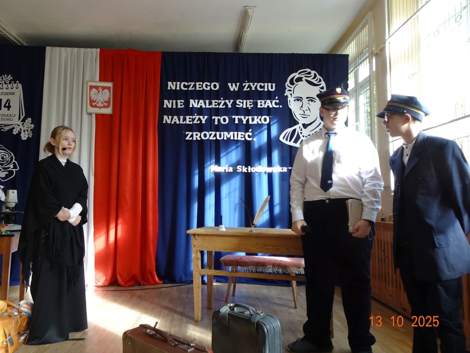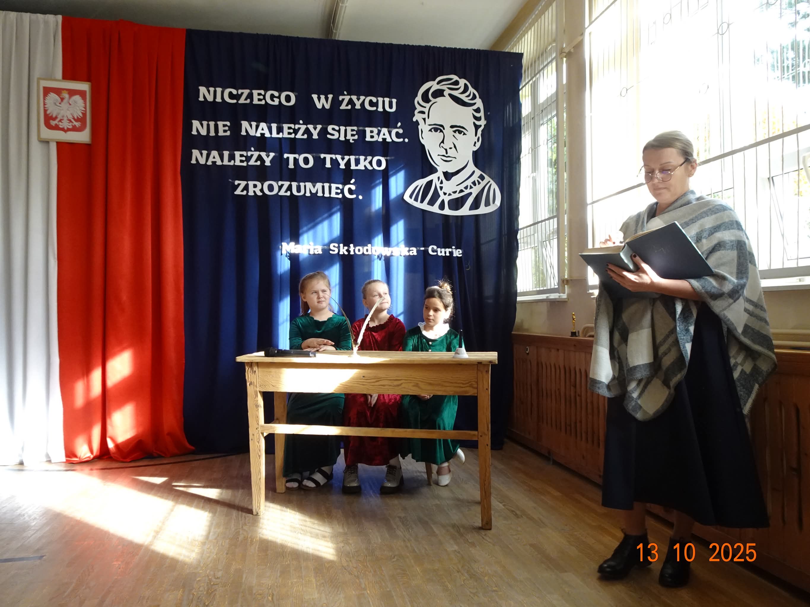 Uroczystość rozpoczęła się nastrojowym spektaklem przygotowanym przez uczniów i nauczycieli szkoły. Przed publicznością pojawiła się postać Marii Skłodowskiej-Curie, symbolicznie powracająca do szkoły. W scenicznej opowieści przeniosła zebranych w świat nauki, odwagi i marzeń – od czasów, gdy młoda „Mania" z uporem i pasją dążyła do poznania prawdy, po współczesność, w której jej imię inspiruje młodych badaczy.
