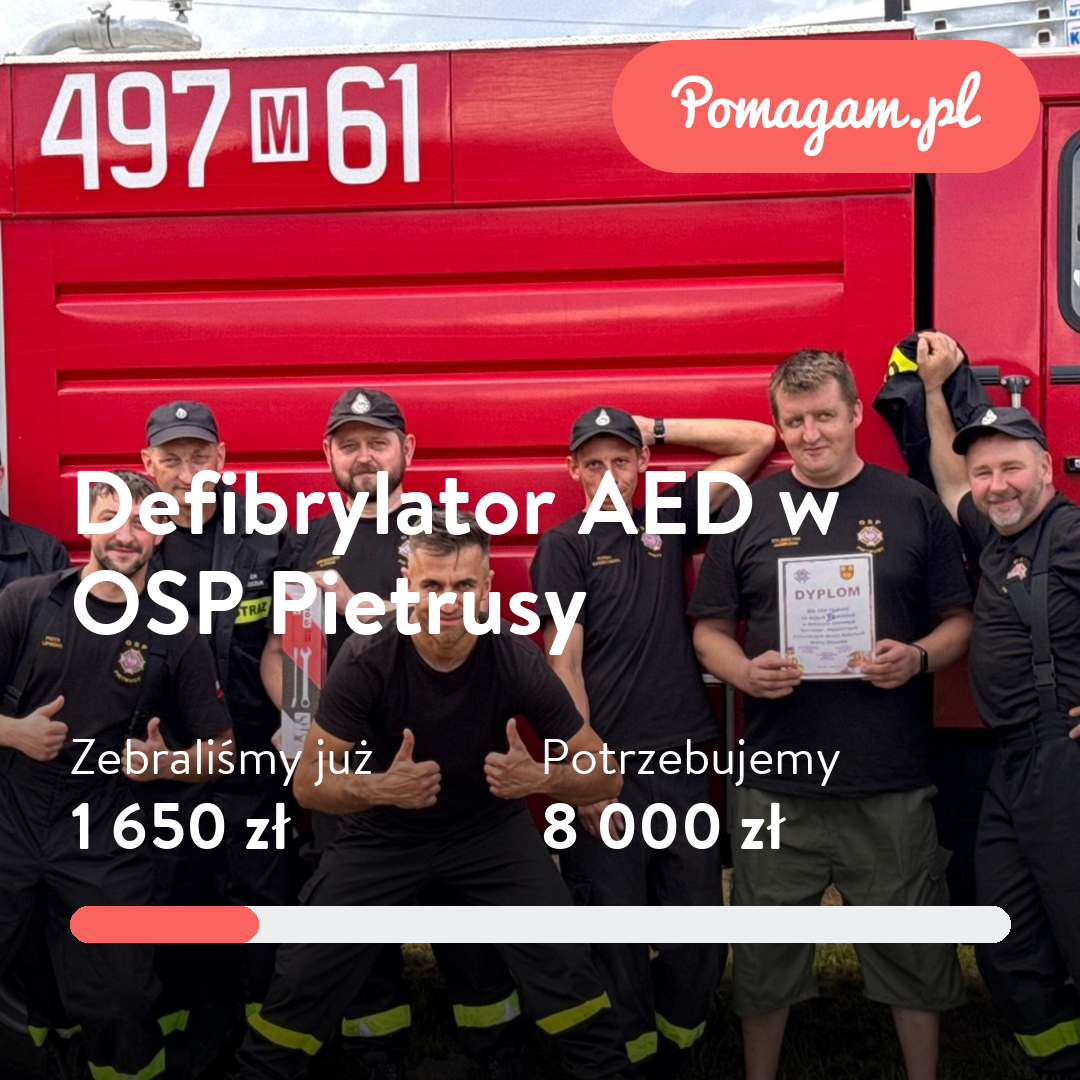 W Pietrusach ruszyła zbiórka pieniędzy na zakup automatycznego defibrylatora zewnętrznego (AED). Celem akcji jest zebranie 8 tysięcy złotych, które pozwolą na zakup i montaż urządzenia przy budynku miejscowej OSP.