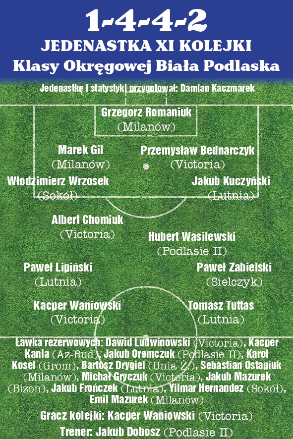 Jedenastka kolejki: 4-4-2, BR: Grzegorz Romaniuk (Milanów), LO: Jakub Kuczyński (Lutnia), LŚO: Przemysław Bednarczyk (Victoria), PŚO: Marek Gil (Milanów), PO: Włodzimierz Wrzosek (Sokół), ŚPD: Albert Chomiuk (Victoria), ŚP: Hubert Wasilewski (Podlasie II), LP: Paweł Zabielski (Sielczyk), PP: Paweł Lipiński (Lutnia), LN: Tomasz Tuttas (Lutnia), PN: Kacper Waniowski (Victoria). ŁAWKA REZERWOWYCH: BR: Dawid Ludwinowski (Victoria), OB: Kacper Kania (Az-Bud), OB: Jakub Oremczuk (Podlasie II), OB: Karol Kosel (Grom), POM: Bartosz Drygiel (Unia Ż.), POM: Sebastian Ostapiuk (Milanów), POM: Michał Gryczuk (Victoria), POM: Jakub Mazurek (Bizon), N: Jakub Frończek (Lutnia), N: Yilmar Hernandez(Sokół), N: Emil Mazurek (Milanów) TRENER: Jakub Dobosz (Podlasie II). GRACZ KOLEJKI: Kacper Waniowski (Victoria). Jedenastkę kolejki i statystyki przygotował Damian Kaczmarek.