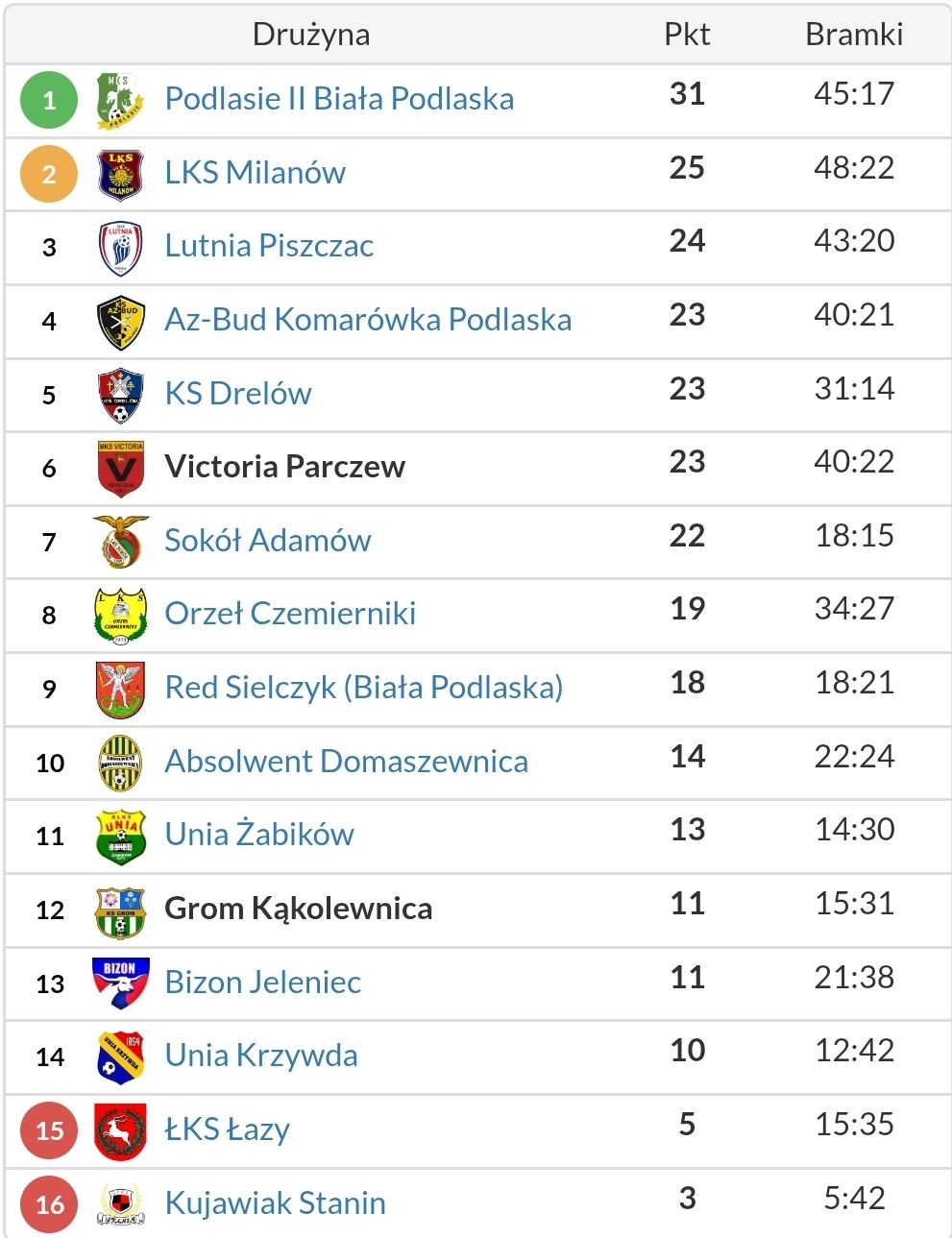 12.kolejka: Az-Bud Komarówka Podlaska - Kujawiak Stanin 3:0 walkower, Podlasie II Biała Podlaska - Orzeł Czemierniki 2:2 (Adam Sacharuk 26' Adrian Siemieniuk 90' - Piotr Kuźma 47', Jan Bożym 72'), Absolwent Domaszewnica - Unia Krzywda 2:0 (Jakub Dołęga 15', 22'), Bizon Jeleniec - Sokół Adamów 4:0 (Michał Botwina 5', Marcin Rybka 45' Dawid Rosłoń 45'+2, Jakub Mazurek 75'), Lutnia Piszczac - LZS Sielczyk 4:0 (Adam Wiraszka 12', Tomasz Tuttas 18', 45', Karol Czarnecki 90'+1), Unia Żabików - KS Drelów 0:3 (Dawid Krasucki 61', Adrian Hołownia 68', Piotr Wojtczuk 84'), LKS Milanów – ŁKS Łazy 4:2 (Sebastian Ostapiuk 25', 86', Marek Gil 70', Wiktor Niziołek 84' - Kacper Bednarczyk 15’, Jakub Rzewuski 58'), Victoria Parczew – Grom Kąkolewnica 2:0 (Adrian Kozłowski 53', Maciej Guz 90').