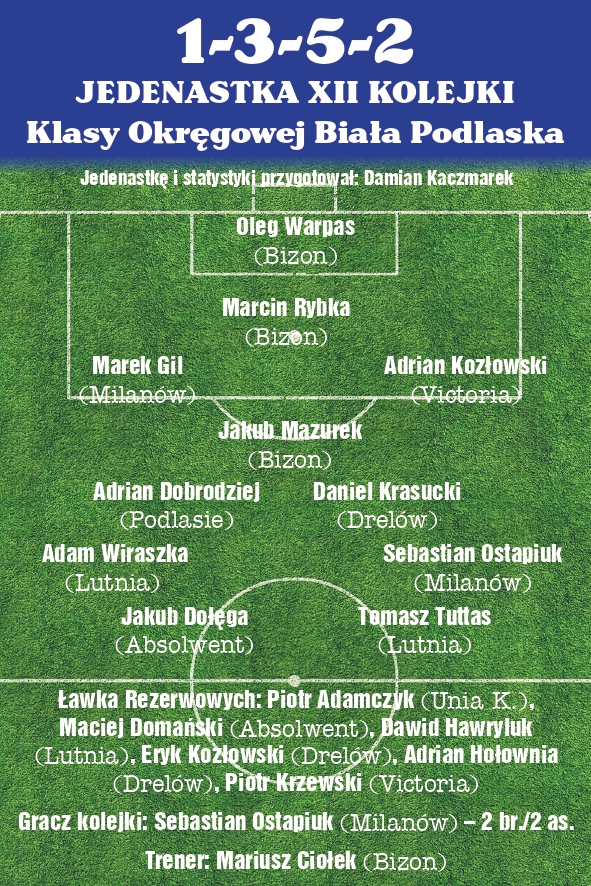 Liderem nadal są rezerwy Podlasia Biała Podlaska, które po raz pierwszy w tym sezonie straciły punkty na własnym boisku remisując 2:2 z Orłem Czemierniki. Piotr Kuźma (Orzeł) zdobył bramkę bezpośrednio z rzutu rożnego. Gospodarze wyrównali w 90 minucie meczu. – Prowadziliśmy 2:1 i chcieliśmy wygrać, niestety nie udało się. Pozostał niedosyt. Patrząc jednak na to jak Podlasie gra zwłaszcza u siebie to jest bardzo dobry wynik – powiedział po meczu Bartosz Mańko, zawodnik i prezes Orła. Również zadowolony z wyniku był trener gości. – Chcieliśmy grać z kontry i bronić się w kompakcie blisko siebie. Udało nam się zrealizować założenia oraz zniwelować różnice głownie kondycyjne. Dla nas jest to zwycięski remis i bardzo nas cieszy – powiedział Konrad Łabęcki, trener Orła. Odmienne nastroje mieli bialczanie. - Jako lider powinniśmy wygrywać. Zależy nam na tym. Nie jesteśmy zadowoleni z tego remisu. Zabrakło skuteczności i chyba za mało stworzyliśmy sytuacji strzeleckich – powiedział Marcin Sawczuk, kapitan rezerw Podlasia. Trener Podlasia II nie był zadowolony, ale komplementował swoich podopiecznych. - Ciężko powiedzieć, że było się lepszym jeśli cały mecz goniło się wynik. Chwała chłopakom za walkę i odrobienie strat. Zawsze lepiej zremisować niż przegrać. Minus to fakt, że do takiej sytuacji dopuściliśmy. Moja ekipa to młodzi zawodnicy, dla których gra w okręgówce nie jest docelowa. Tu się ogrywają i dążą by w przyszłości grać profesjonalnie w piłkę. Jestem dumny z współpracy z nimi. Chłopaki szybko się uczą - powiedział Jakub Dobosz, trener rezerw Podlasia. LKS Milanów pokonał u siebie ŁKS Łazy 4:2 i o dwa punkty zmniejszył stratę do Podlasia. Do niespodzianki doszło w Jeleńcu gdzie miejscowy Bizon ograł trzeciego w tabeli Sokoła Adamów aż 4:0. Mogło być jeszcze wyżej, ale w 70 minucie rzutu karnego nie wykorzystał Michał Botwina. Jego strzał obronił bramkarz Sokoła, Norbert Osial. Swoje mecze wygrała Lutnia Piszczac i Victoria Parczew. Obie drużyny trzymają kontakt z czołem tabeli. Podobnie jak beniaminek z Drelowa, który gładko 3:0 wygrał z Żabikowie. Absolwent Domaszewnica pokonał Unię Krzywda 2:0. W 43 minucie rzutu karnego dla Absolwenta Domaszewnica nie wykorzystał Konrad Pioruński, kolejną jedenastkę przyznaną przez sędziego Adriana Jesionka spudłował Jakub Dołęga w 81 minucie. Obie jedenastki zatrzymał bramkarz Unii Krzywda, Piotr Adamczyk. Kujawiak Stanin nie stawił się na mecz do Komarówki Podlaskiej stąd Az-Bud zainkasował punkty walkowerem. W 12.kolejce zdobyto łącznie 28 bramek (25 w meczach, 3 za walkower) co daje średnią 3.5 bramki na spotkanie.