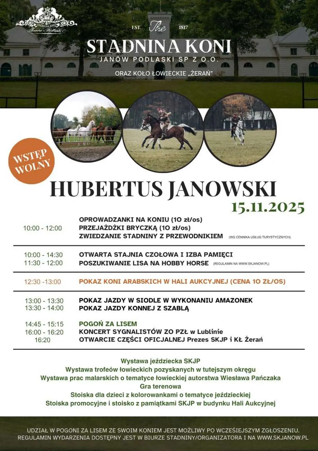 Stadnina Koni Janów Podlaski oraz Koło Łowieckie „Żerań” zapraszają na hubertus janowski – doroczne, tradycyjne święto jeździectwa i myśliwych, które odbędzie się 15 listopada na terenie janowskiej stadniny. To doskonała okazja, aby spędzić dzień w otoczeniu koni arabskich, natury oraz pasjonatów jeździectwa i tradycji. Wstęp jest wolny.