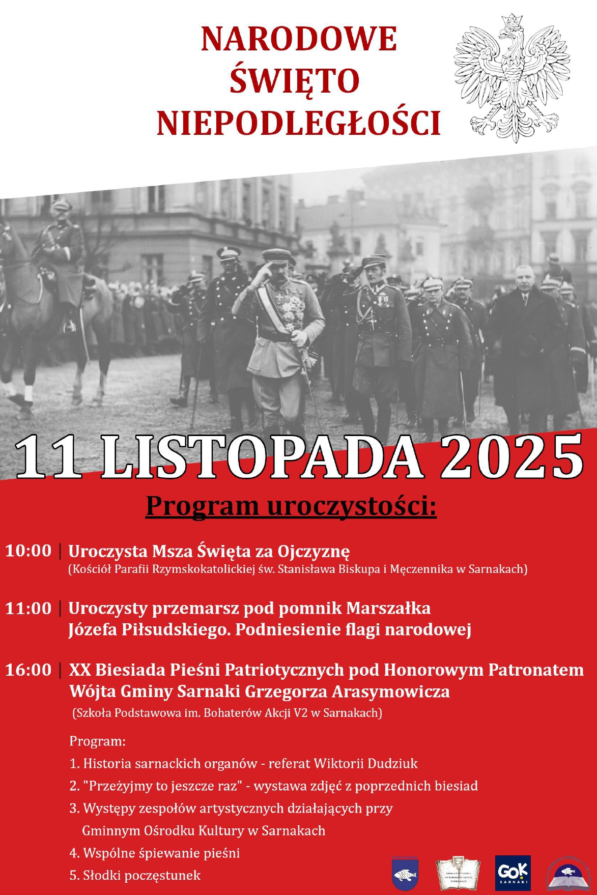 O godzinie 16:00 w Szkole Podstawowej im. Bohaterów Akcji V2 w Sarnakach rozpocznie się XX Biesiada Pieśni Patriotycznych pod honorowym patronatem wójta gminy Grzegorza Arasymowicza. W programie zaplanowano: referat Wiktorii Dudziuk pt. „Historia sarnackich organów”, wystawę fotograficzną „Przeżyjmy to jeszcze raz” przypominającą poprzednie edycje biesiady, występy zespołów artystycznych działających przy Gminnym Ośrodku Kultury w Sarnakach, wspólne śpiewanie pieśni patriotycznych oraz słodki poczęstunek.
