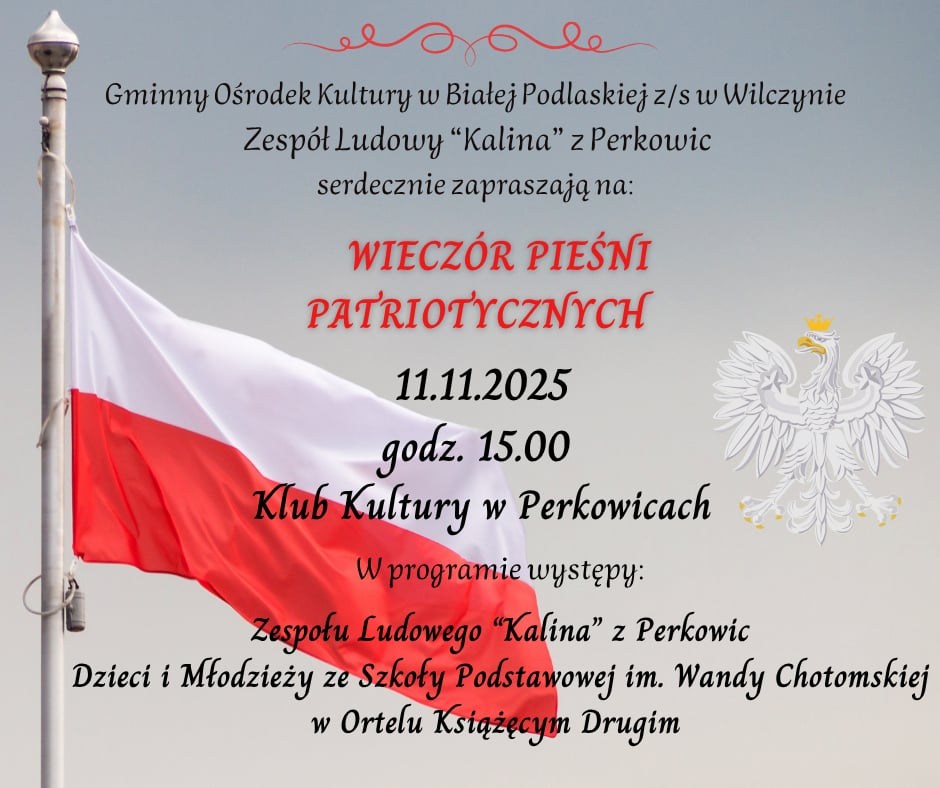 Koncert odbędzie się 11 listopada 2025 roku o godzinie 15:00 w Klubie Kultury w Perkowicach. W programie przewidziane są występy Zespołu Ludowego "Kalina" z Perkowic oraz Dzieci i Młodzieży ze Szkoły Podstawowej im. Wandy Chotomskiej w Ortelu Książęcym Drugim.