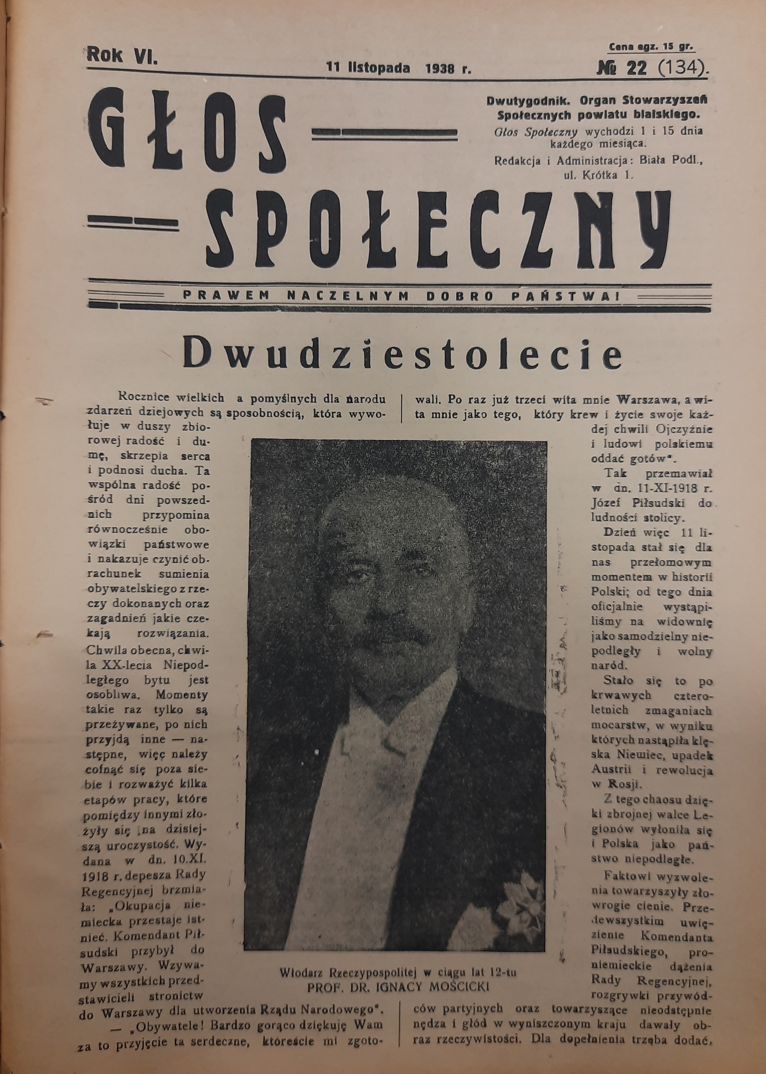 W numerze z 11 listopada 1938 roku Głos Społeczny otwierał wydanie wielkim tytułem „Dwudziestolecie” i portretem z podpisem: „Włodarz Rzeczpospolitej w ciągu 12-tu lat – prof. dr Ignacy Mościcki.” Ton jubileuszowy łączył wspomnienie listopada 1918 roku z refleksją nad dorobkiem państwa i obowiązkami obywatelskimi. Redakcja pisała, że rocznice „wywołują w duszy zbiorowej radość i dumę, skrzepią serca i podnoszą ducha”, a zarazem skłaniają do „rachunku sumienia obywatelskiego”.