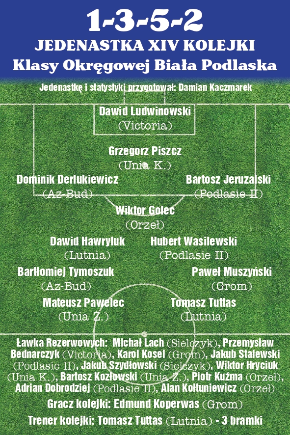 Jedenastka kolejki: 3-5-2 BR: Dawid Ludwinowski (Victoria), LO: Bartosz Jeruzalski (Podlasie II), ŚO: Grzegorz Piszcz (Unia K.), PO: Dominik Derlukiewicz (Az-Bud), ŚPD: Wiktor Golec (Orzeł), LŚP: Hubert Wasilewski (Podlasie II), PŚP: Dawid Hawryluk (Lutnia), LP: Paweł Muszyński (Grom), PP: Bartłomiej Tymoszuk (Az-Bud), LN: Tomasz Tuttas (Lutnia), PN: Mateusz Pawelec (Unia Ż.). ŁAWKA REZERWOWYCH: BR: Michał Lach (Sielczyk), O: Przemysław Bednarczyk (Victoria), O: Karol Kosel (Grom), O: Jakub Stalewski (Podlasie II), O: Jakub Szydłowski (Sielczyk), POM: Wiktor Hryciuk (Unia K.), POM: Bartosz Kozłowski (Unia Ż.), POM: Piotr Kuźma (Orzeł), N: Adrian Dobrodziej (Podlasie II), N: Alan Kołtuniewicz (Orzeł). TRENER KOLEJKI: Edmund Koperwas (Grom). GRACZ KOLEJKI: Tomasz Tuttas (Lutnia) - 3 bramki. Jedenastkę kolejki i statystyki przygotował Damian Kaczmarek.