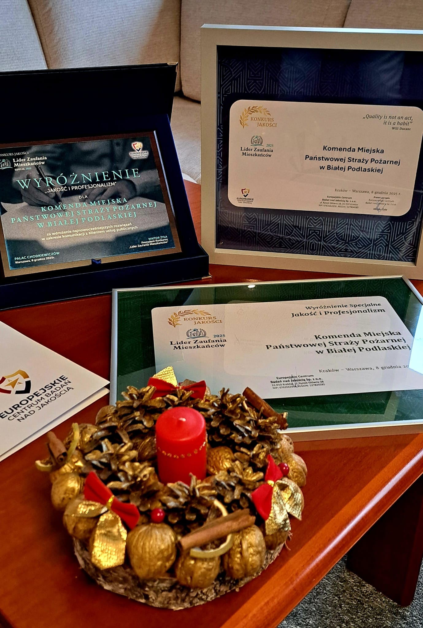 „Licencję Jakości” otrzymują instytucje, które cechują się wysoką jakością obsługi mieszkańca, profesjonalnym podejściem do klienta korzystającego z usług publicznych oraz nowoczesnością w budowaniu relacji ze swoimi interesantami. KM PSP otrzymała wyróżnienie specjalne „Jakość i profesjonalizm”.