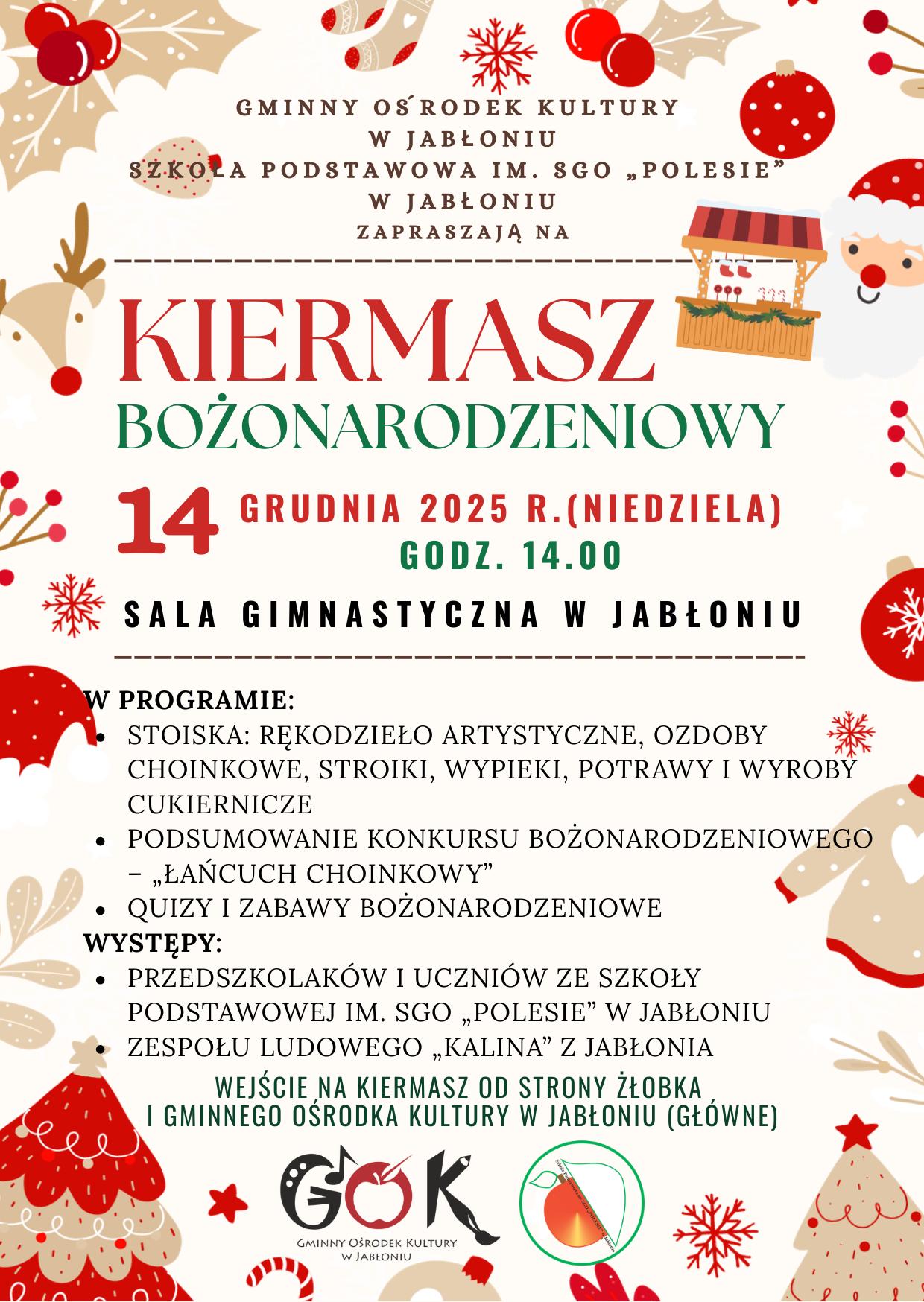 Kiermasz bożonarodzeniowy odbędzie się 14 grudnia (w niedzielę) na sali gimnastycznej szkoły podstawowej w Jabłoniu. Rozpocznie się o godzinie 14:00.
