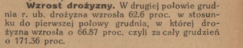 Skala wzrostu cen najlepiej widoczna jest w danych opublikowanych rok później. W numerze „Podlasiaka” z 6 stycznia 1924 r. informowano, że w drugiej połowie grudnia 1923 r. drożyzna wzrosła o 62,6 proc. w porównaniu z pierwszą połową miesiąca, w której ceny podniosły się o 66,87 proc. W ujęciu miesięcznym oznaczało to wzrost aż o 171,36 proc. Tak gwałtowne tempo zmian sprawiało, że racjonalne planowanie wydatków – także tych związanych ze świętami – było w praktyce niemożliwe.