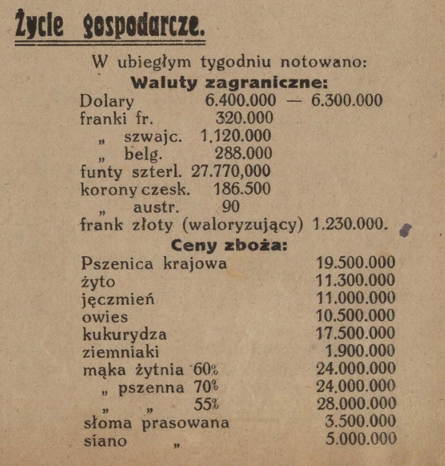 W archiwalnych numerach „Podlasiaka” – tygodnika polityczno-społeczno-narodowego, poświęconego sprawom ludu podlaskiego – z początku lat 20. XX w., temat drożyzny powraca regularnie, a opisy cen brzmią dziś niemal niewiarygodnie. W wydaniu z 6 stycznia 1923 r. opublikowano artykuł zatytułowany „Amerykańskie ceny w porównaniu z naszemi”, w którym autor zestawiał realia gospodarcze Stanów Zjednoczonych i Polski, przeliczając dolary na obowiązujące wówczas w kraju marki polskie. Z tych wyliczeń wynikało, że w USA korzec pszenicy kosztował 26 250 000 marek polskich, żyta 17,5 miliona, jęczmienia 15 750 000, a owsa 11 500 000 marek. Autor podkreślał przy tym, że choć nominalnie ceny w Polsce były niższe, to sytuacja materialna społeczeństwa wyglądała znacznie gorzej. Zarobki były jedynie ułamkiem dochodów amerykańskich, co sprawiało, że nawet „tańsze” produkty pozostawały dla wielu trudno dostępne.
