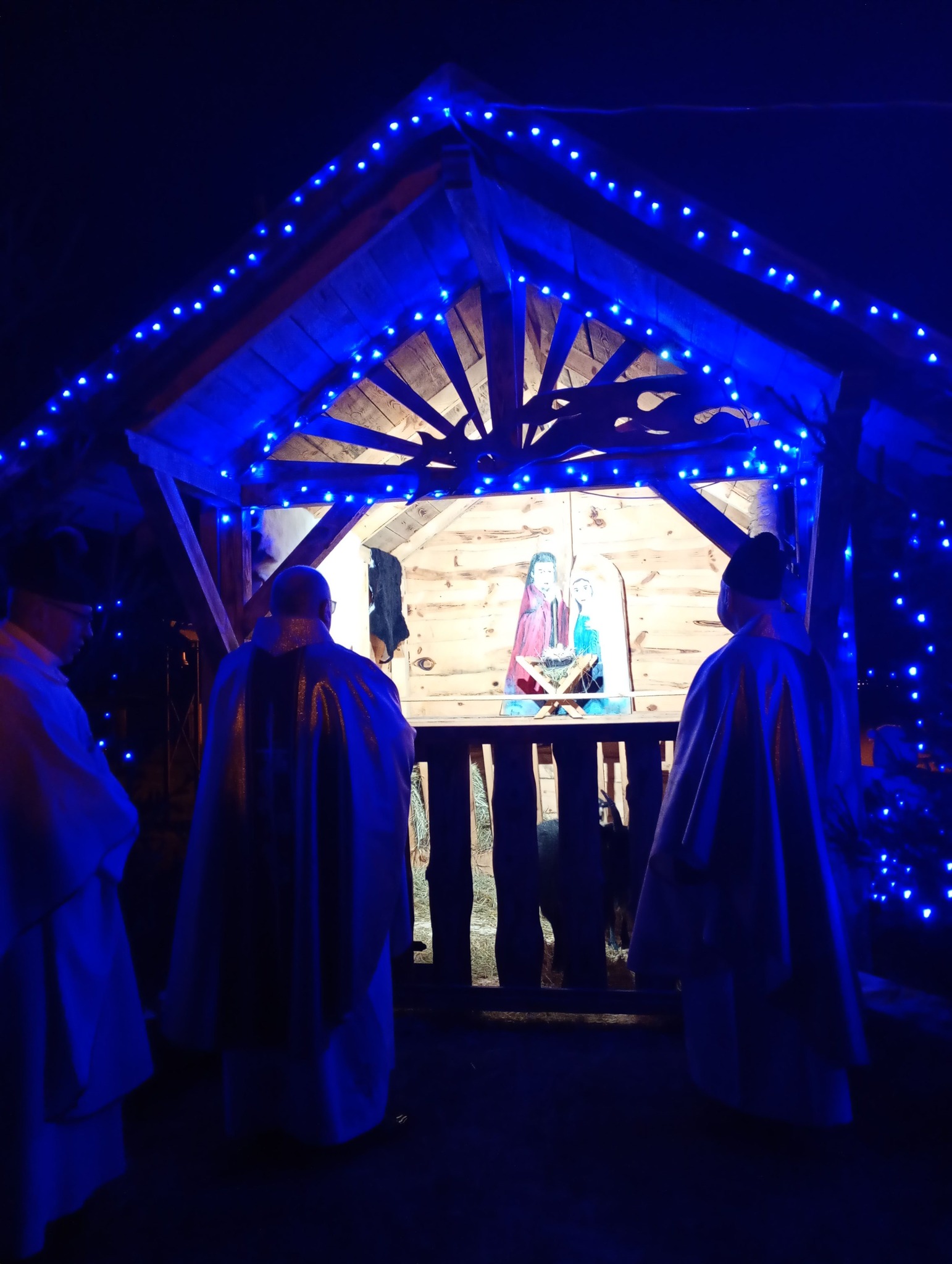 Na zewnątrz kościoła pw. Trójcy Świętej w Huszczy stoi żywa szopka. Świętej Rodzinie towarzyszą owce, kozy. Drewniana szopka jest pięknie oświetlona.