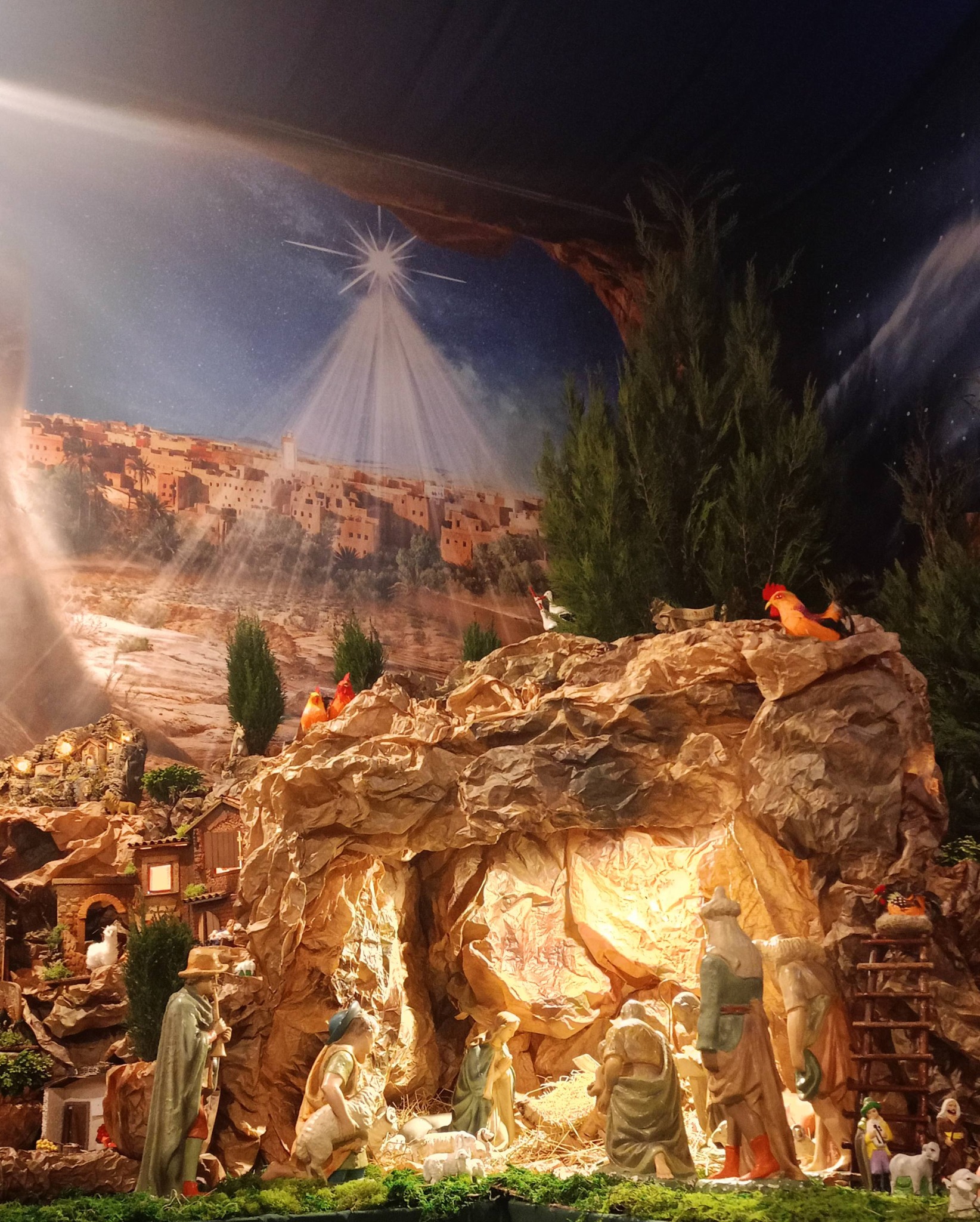 Szopkę przygotowała grupa parafian, która już po raz drugi pokazała, że jest bardzo kreatywna. Całość jest trójwymiarowa i została osadzona na skałach. W tle są dawne miasta, a centrum stanowi grota. A w niej Święta Rodzina i przybyli na miejsce Trzej Królowie i pastuszkowie. Ale to nie wszystko. Wokół tętni codzienne życie. Są domki, wiatraki, kowal, piekarz i inne figurki. Niektóre elementy są ruchome. Uroku dodają figurki zwierząt i zielona roślinność, w tym wypadku są to tuje.