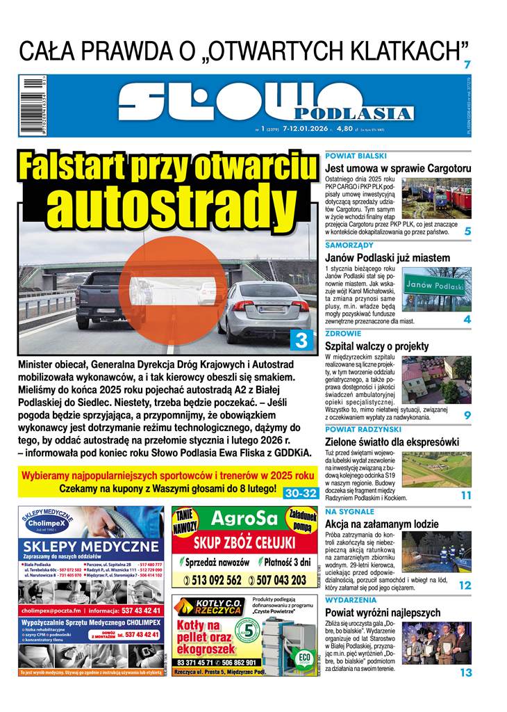 - Falstart przy otwarciu autostrady. Minister obiecał, Generalna Dyrekcja Dróg Krajowych i Autostrad mobilizowała wykonawców, a i tak kierowcy obeszli się smakiem. Mieliśmy do końca 2025 roku pojechać autostradą A2 z Białej Podlaskiej do Siedlec. Niestety, trzeba będzie poczekać. - Jeśli pogoda będzie sprzyjająca, a przypomnijmy, że obowiązkiem wykonawcy jest dotrzymanie reżimu technologicznego, dążymy do tego, by oddać autostradę na przełomie stycznia i lutego 2026 r. - informowała pod koniec roku Słowo Podlasia nam Ewa Fliska z GDDKiA.