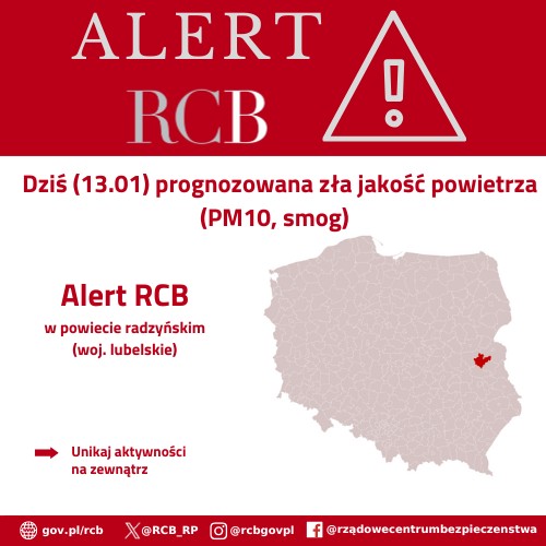 Ostrzeżenie zostało rozesłane do odbiorców na terenie powiatu radzyńskiego w województwie lubelskim. Zgodnie z komunikatem, podwyższone stężenia pyłu zawieszonego mogą utrzymywać się przez cały dzień i stanowić zagrożenie dla zdrowia.