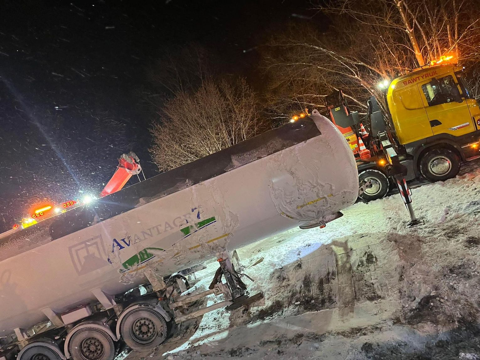 Po zakończeniu działań ratowniczych przystąpiono do podnoszenia przewróconej cysterny. Do tego celu wykorzystano specjalistyczny sprzęt pomocy drogowej, w tym ciężkie holowniki i dźwigi: Scanię R 500 z żurawiem Palfinger PK 100002 o udźwigu 30 ton, Scanię R 660 oraz Mana z Palfingerem PK 150002 o udźwigu 40 ton. Operacja stawiania cysterny była prowadzona z zachowaniem pełnych procedur bezpieczeństwa.