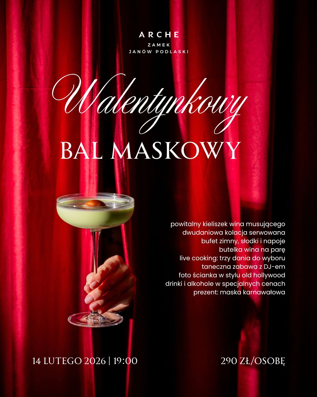 Wydarzenie odbędzie się 14 lutego, o godzinie 19:00. W programie wieczoru m.in. powitalny kieliszek wina musującego, dwudaniowa kolacja serwowana, bufet zimny, słodki i napoje, butelka wina na parę oraz live cooking – trzy dania do wyboru. O oprawę muzyczną zadba DJ, a goście będą mogli skorzystać z fotościanki w stylu old Hollywood oraz specjalnych cen na drinki i alkohole. Na każdego uczestnika czeka także prezent – maska karnawałowa. Koszt udziału w balu wynosi 290 zł za osobę.