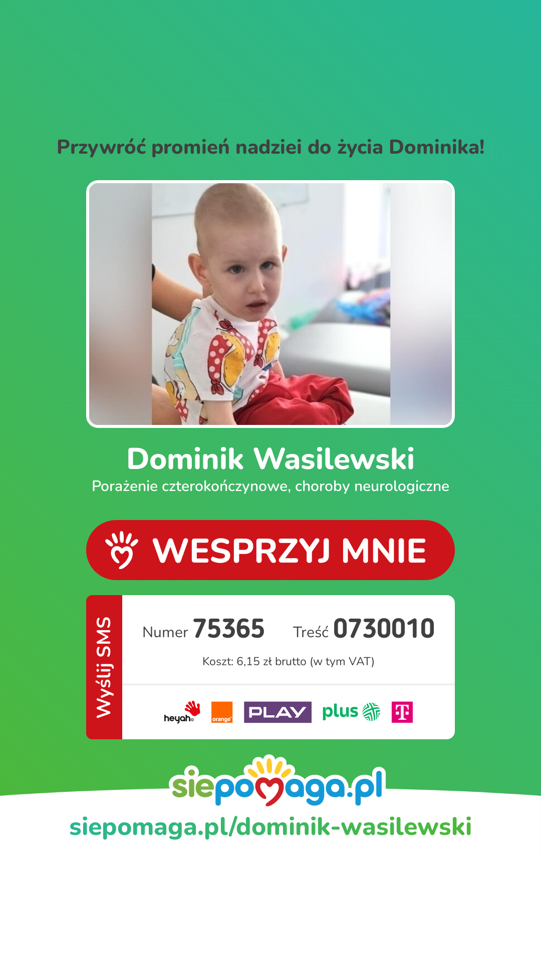 Dominik ma cztery lata. Problemy zdrowotne zaczęły być widoczne około pół roku po urodzeniu, podczas kontroli neurologicznej. Z czasem stwierdzono porażenie, jednak przyczyna jego stanu wciąż nie jest znana. Dotychczasowe badania jej nie wykazały i nadal trwa jej poszukiwanie.