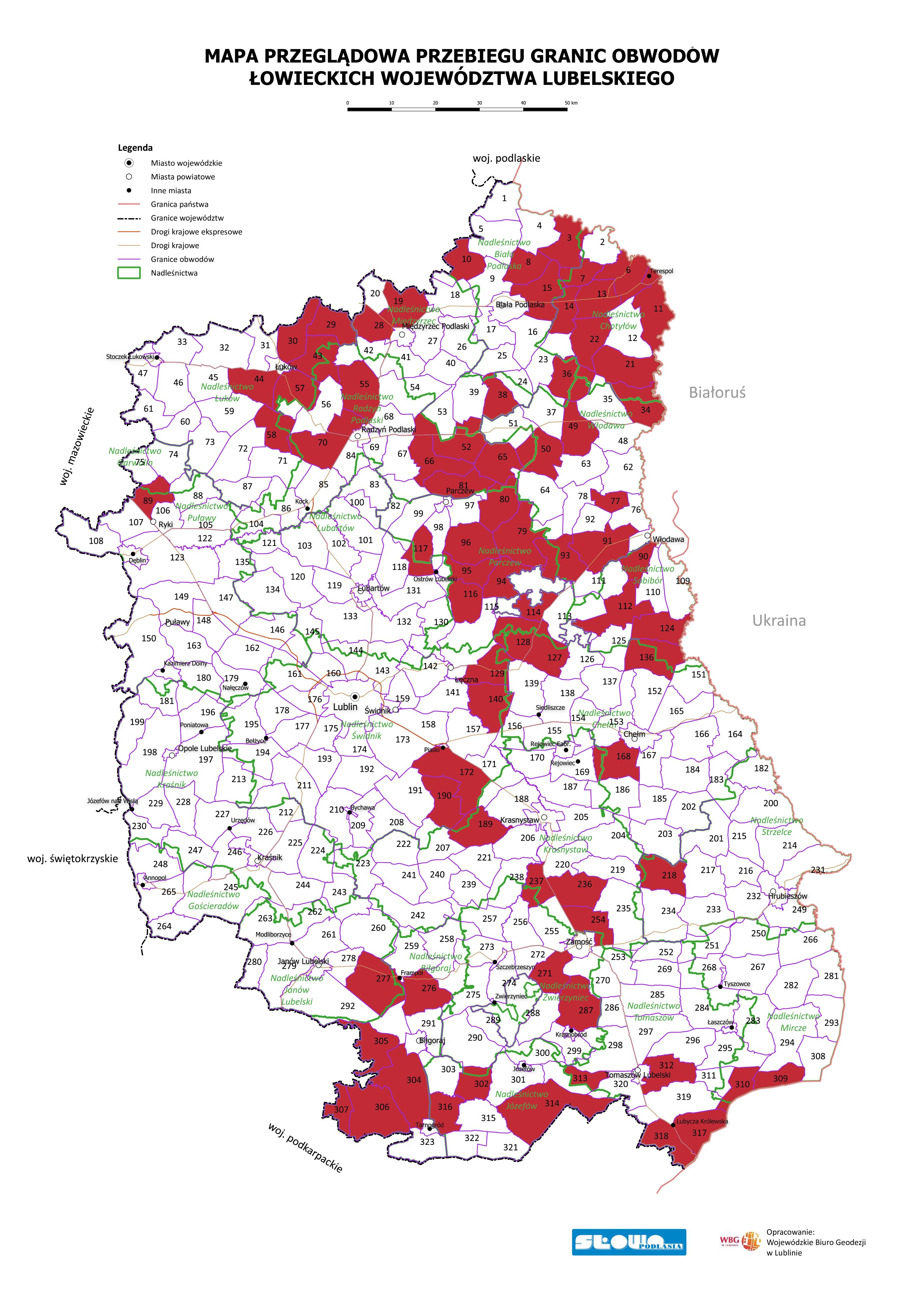 Na mapie przeglądowej przebiegu granic obwodów łowieckich województwa lubelskiego nanieśliśmy obwody, które zostały wymienione w rozporządzeniu wojewody lubelskiego. Należy zauważyć, że granice wyznaczonych terenów łowieckich nie pokrywają się w pełni z granicami administracyjnymi wymienionych powiatów.