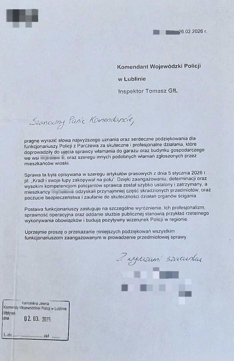 Na ręce komendanta wojewódzkiego policji w Lublinie, inspektora Tomasza Gila, wpłynęło podziękowanie dla funkcjonariuszy pionu kryminalnego parczewskiej jednostki. List stanowi wyraz uznania za profesjonalne i zaangażowane działania, które doprowadziły do ustalenia i zatrzymania sprawcy włamań do budynków gospodarczych na terenie gminy Dębowa Kłoda.