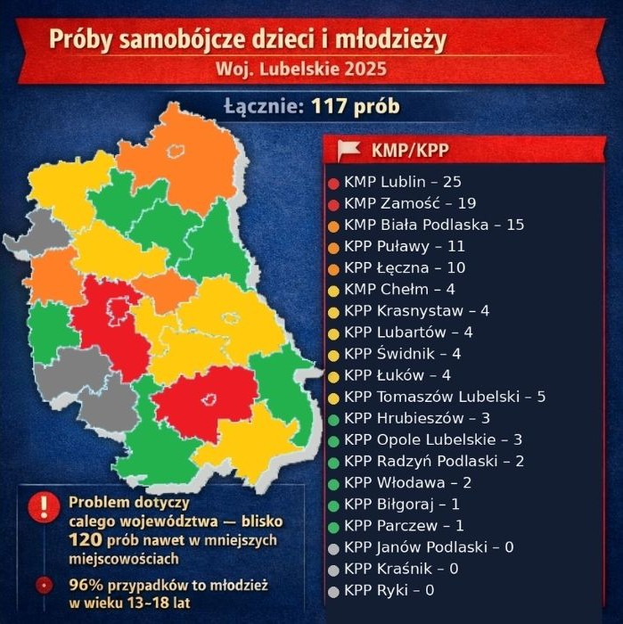 W mniejszych powiatach liczby są niższe, ale nie oznacza to braku problemu. W Chełmie odnotowano 4 próby samobójcze, podobnie m.in. w Krasnymstawie, Lubartowie, Świdniku i Łukowie. Z kolei w Tomaszowie Lubelskim było ich 5, a w Hrubieszowie – 3.