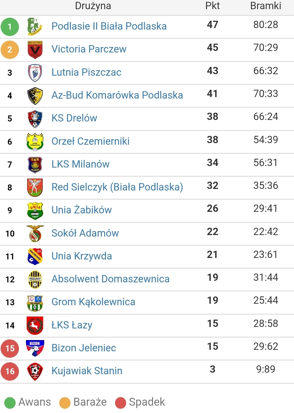 Wyniki 20.kolejki: Milanów - Victoria 0:1 (Kacper Waniowski 61'), Lutnia - Podlasie II 5:1 (Adam Wiraszka 12', Jakub Kuczyński 45', Oskar Materek 49', Milan Storto 73', Paweł Lipiński 84' - Marcin Sawczuk (RK) 81'), Łazy - Kujawiak 3:0 (Igor Grzelak 48', Radosław Szustek 65', 85' ), Unia K. – Drelów 2:6 (Wiktor Hryciuk 38', Arkadiusz Białach 45'+2 - Piotr Wojtczuk 17', 63', Adrian Hołownia 35', Daniel Krasucki 52', (RK) 56', 86'), Sokół - Orzeł 1:4 (Mateusz Baran (RK) 76' - Jan Bożym 24', 73', Alan Kołtuniewicz 61', Piotr Kuźma 90'+3), Sielczyk - Grom 3:0 (Paweł Bartosiak 29', (RK) 39', Jan Lewczuk 49'), Bizon - Unia Ż. 0:2 (Jacek Cybul 56', 88'), Absolwent - Az-Bud 1:5 (Paweł Nurzyński 65' - Antoni Zieniuk 21', 46', Daniel Korol 33', Igor Paczuski 57', Kacper Kania 76').