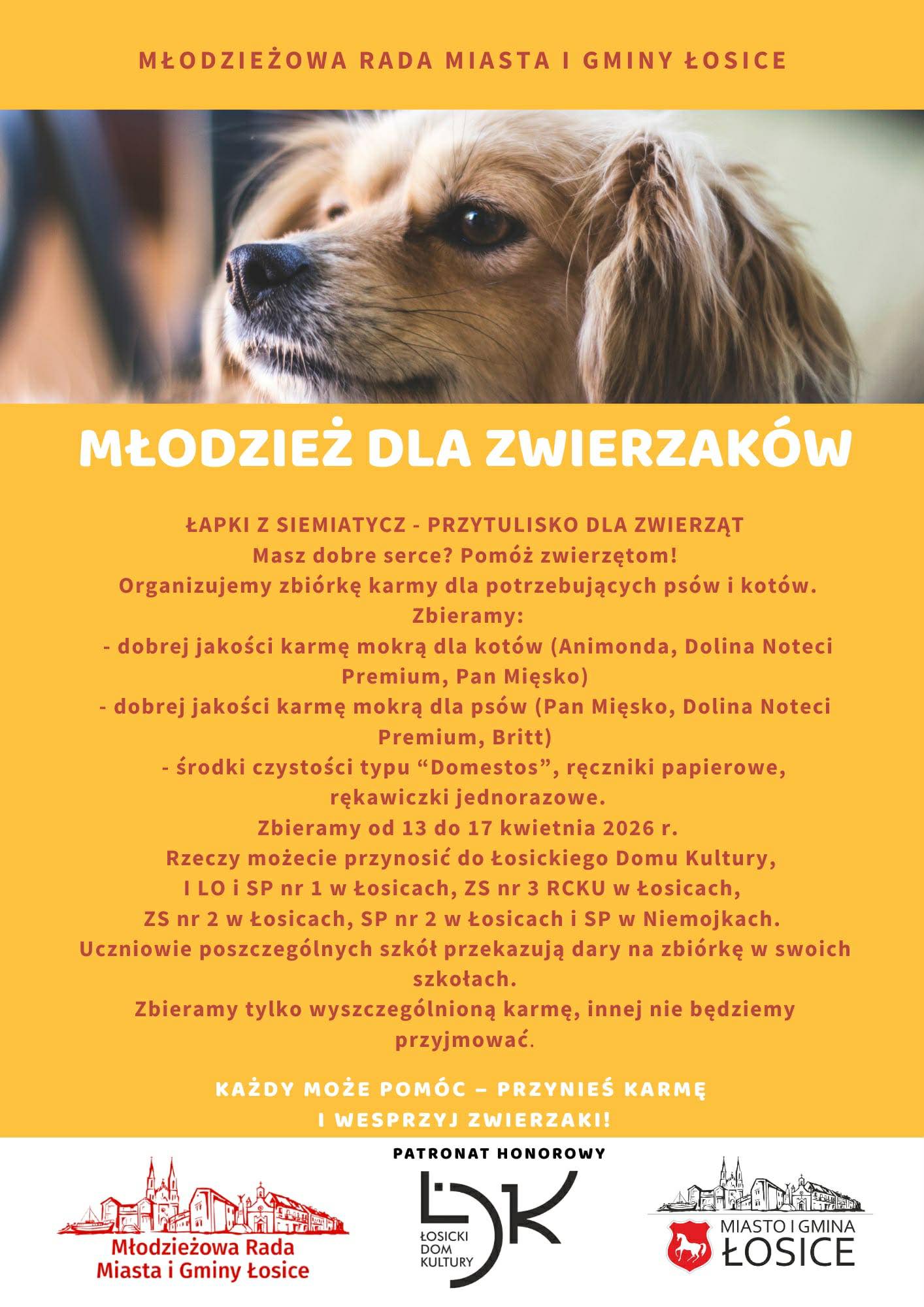 Młodzieżowa Rada Miasta i Gminy Łosice zainicjowała akcję charytatywną „Młodzież dla zwierzaków”, której celem jest wsparcie podopiecznych Przytuliska dla Zwierząt „Łapki” w Siemiatyczach. Zbiórka darów potrwa od 13 do 17 kwietnia. Inicjatywa odbywa się pod patronatem honorowym Łosickiego Domu Kultury oraz Miasta i Gminy Łosice.