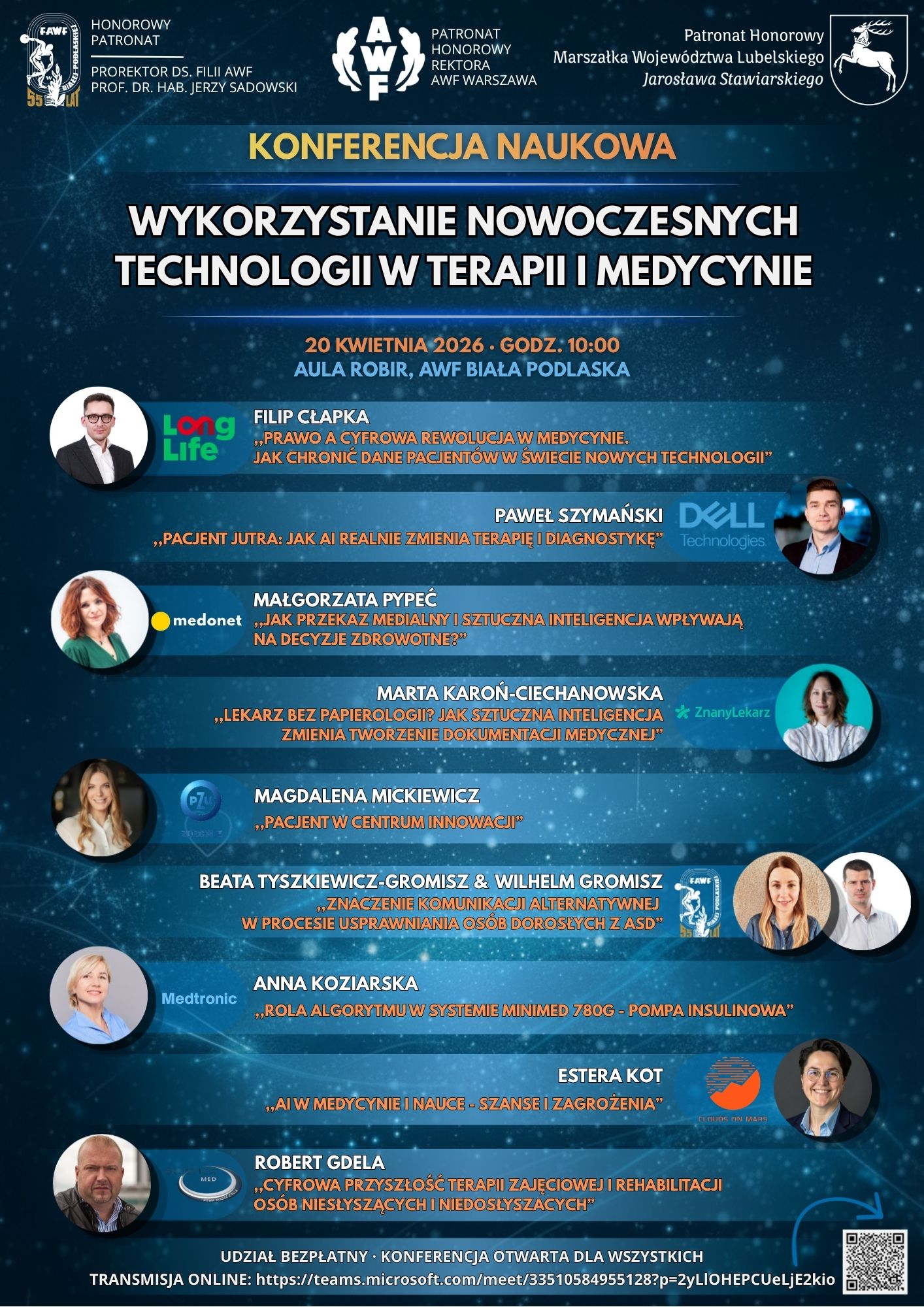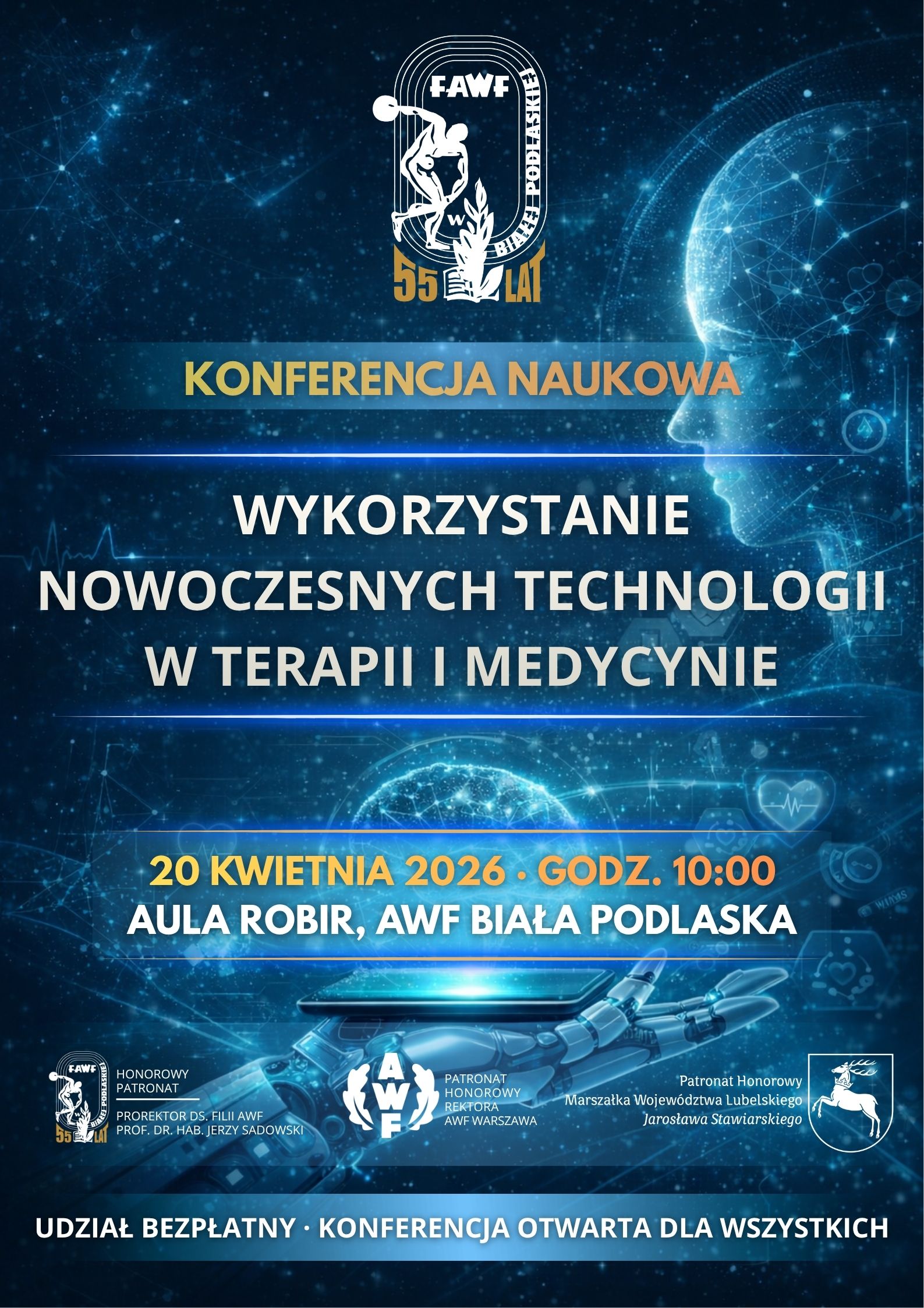 - Wydarzenie skierowane jest do przedstawicieli środowiska medycznego, w tym lekarzy, pielęgniarek, fizjoterapeutów, terapeutów zajęciowych, a także studentów kierunków medycznych oraz kandydatów na studia. Celem konferencji jest prezentacja najnowszych osiągnięć naukowych oraz praktycznych zastosowań nowoczesnych technologii w rehabilitacji, terapii i medycynie, jak również integracja środowiska naukowego z praktyką kliniczną - mówi prodziekan ds. rozwoju prof. Filii AWF w Białej Podlaskiej Anna Bodasińska.