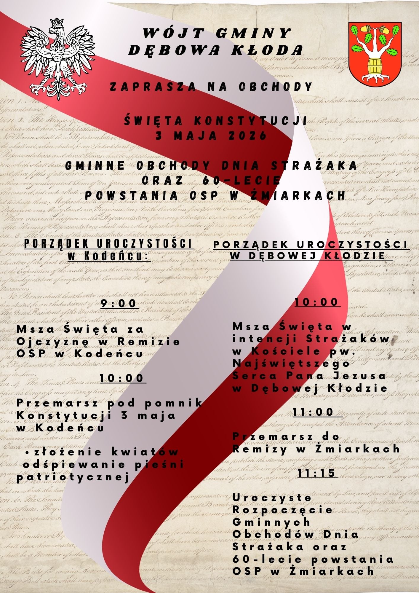 Uroczystości odbędą się w niedzielę, 3 maja, w dwóch miejscowościach. Obchody w Kodeńcu rozpoczną się o godzinie 9:00 mszą świętą za ojczyznę w miejscowej remizie OSP. Następnie o godzinie 10:00 zaplanowano przemarsz pod pomnik konstytucji 3 Maja, gdzie zostaną złożone kwiaty i wybrzmią pieśni patriotyczne.