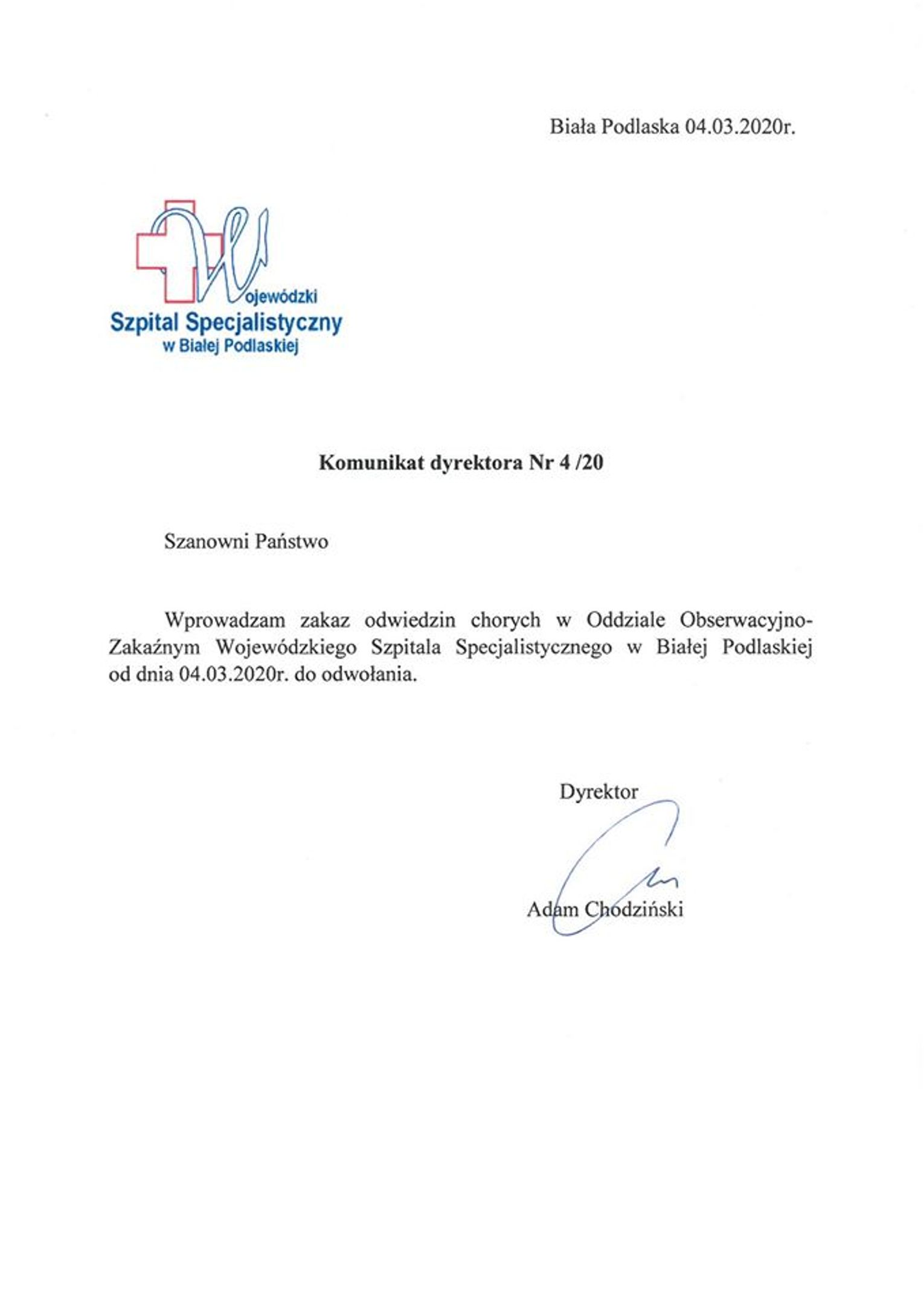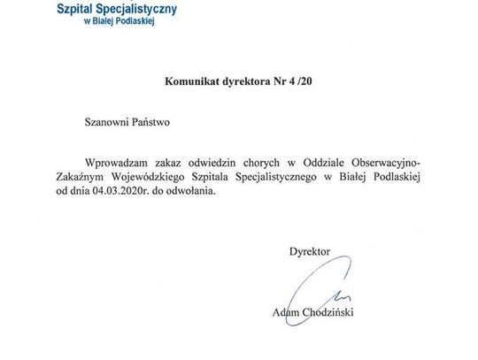 Dyrektor Wojewódzkiego Szpitala Specjalistycznego w Białej Podlaskiej, Adam Chodziński, wprowadził zakaz odwiedzin chorych w Oddziale Obserwacyjno - Zakaźnym bialskiego szpitala. Zakaz obowiązuje od dnia 4 marca do odwołania. Ma to związek z profilaktyką przed rozprzestrzenianiem się koronawirusa o nazwie SARS-Cov-2, który wywołuje chorobę o nazwie COVID-19.