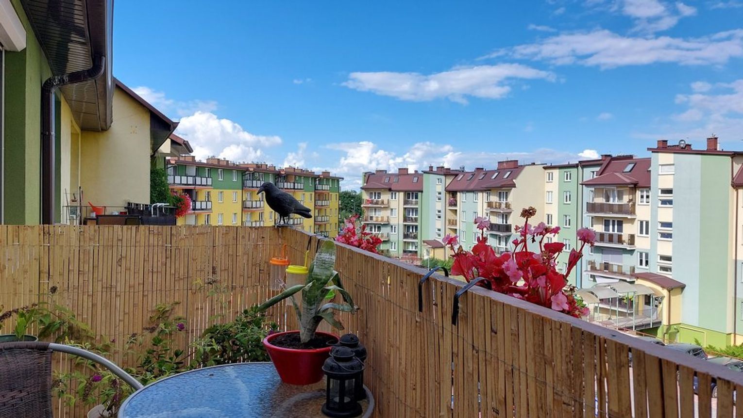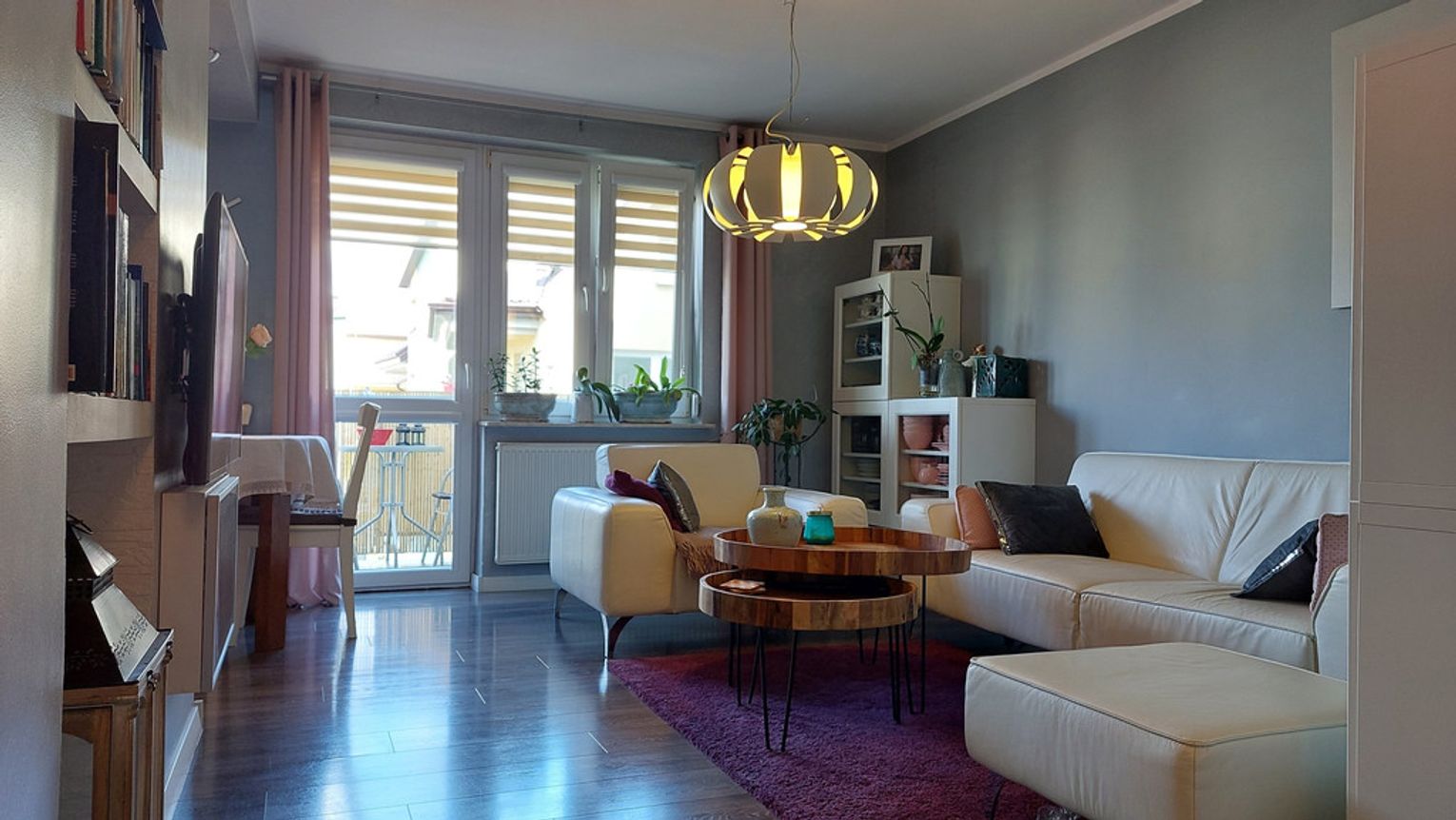 Z salonu jest wyjście na balkon rozciągający się przez całą szerokość pokoju