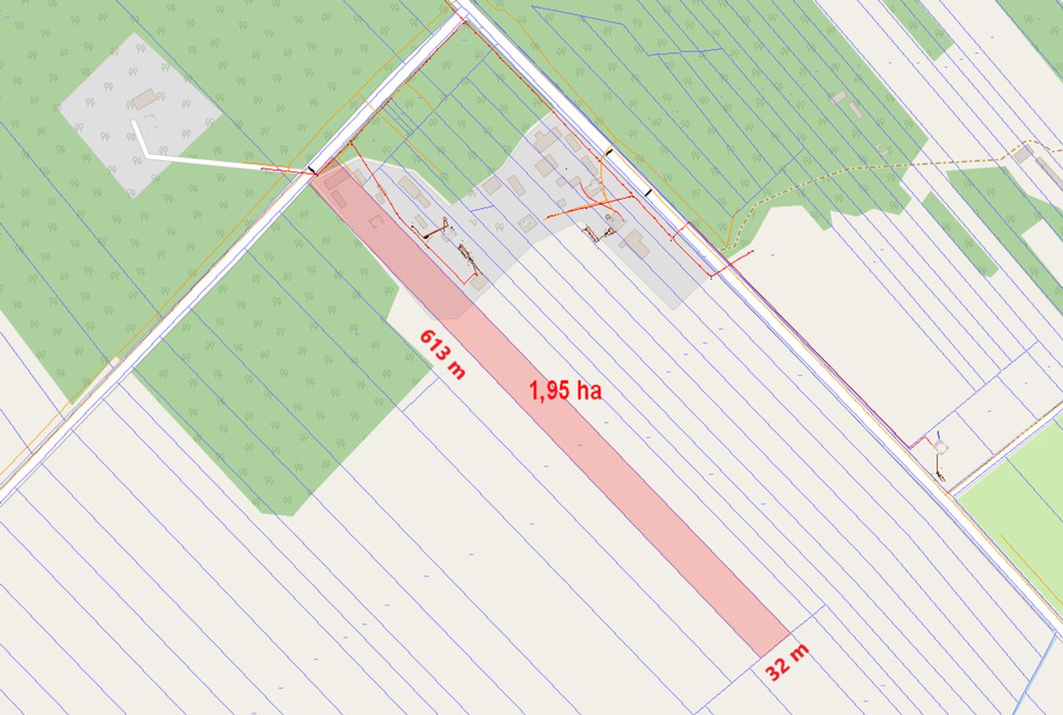 - szerokość działki ok. 32 m, długość ok. 613 m