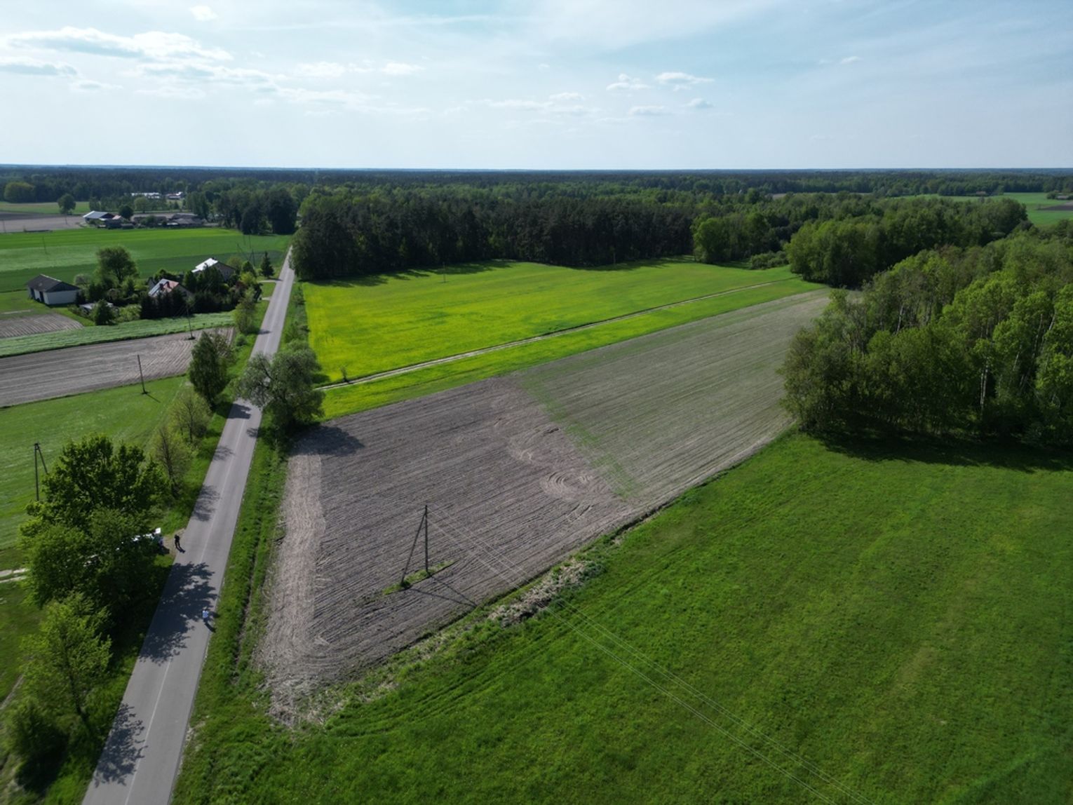 Działki w prostokącie, teren płaski, nie podmokły w okolicy pojedyncze zabudowania.