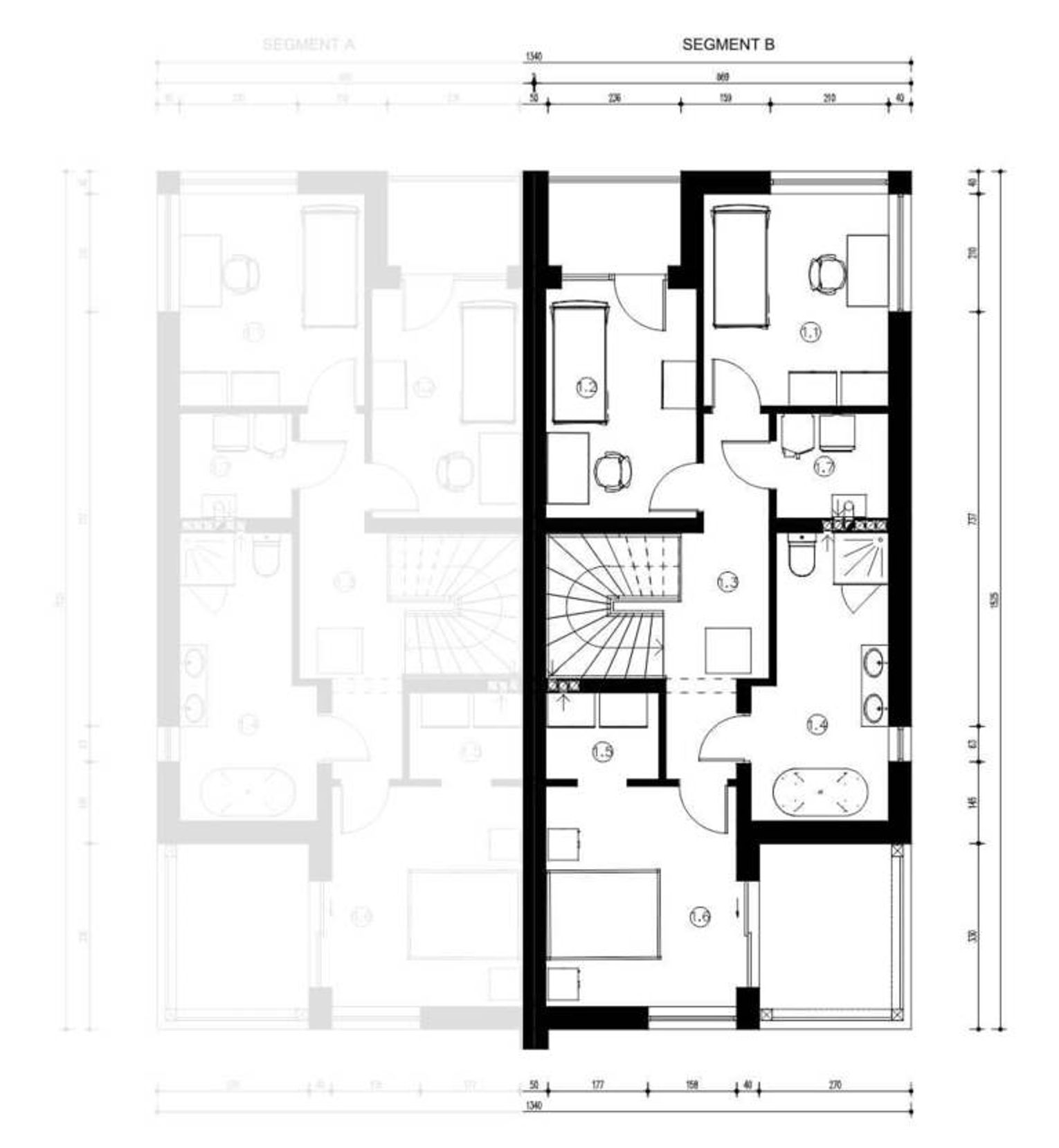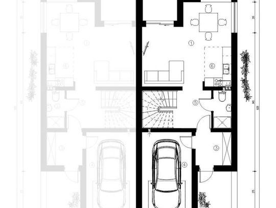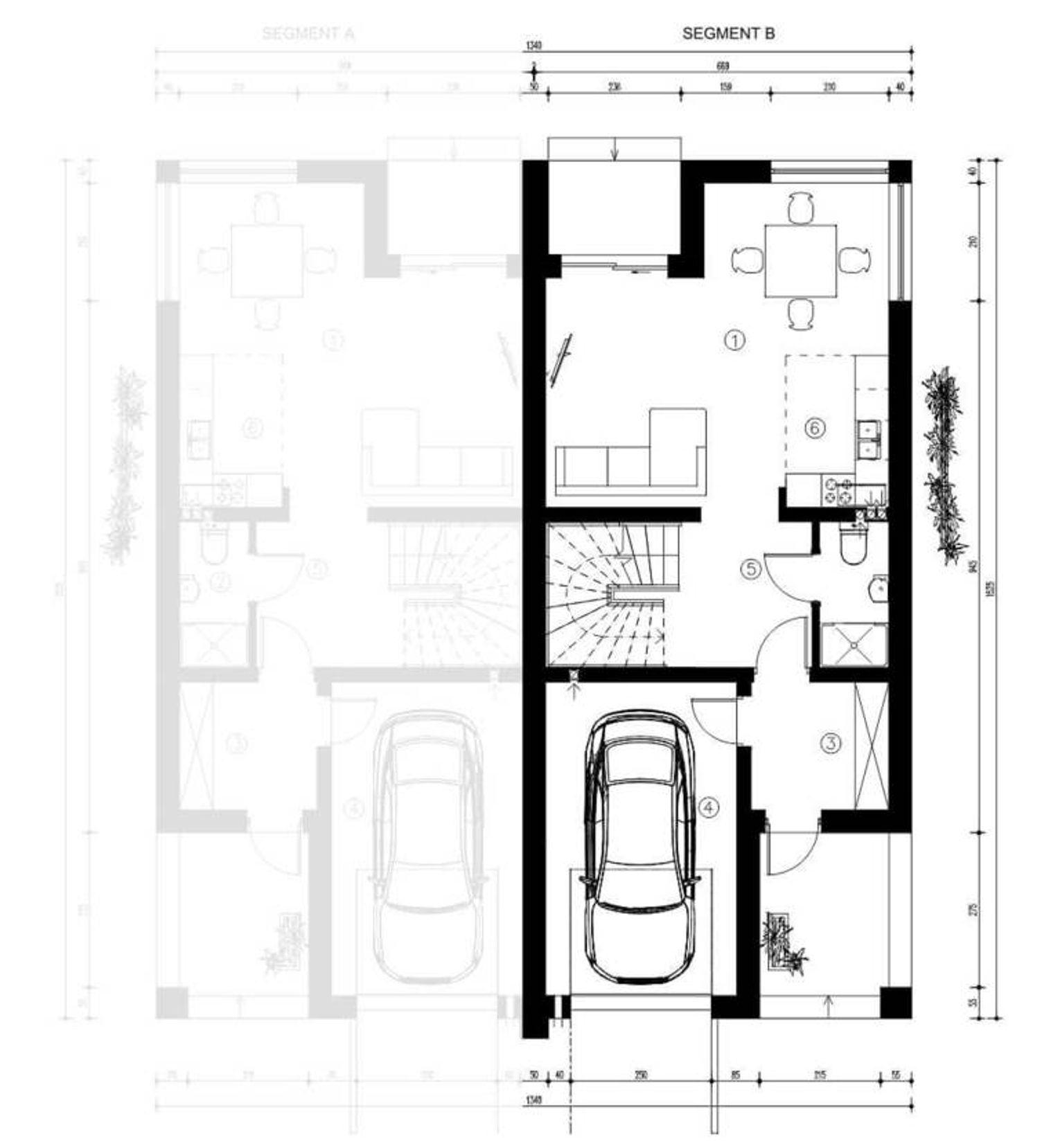 Każdy z segmentów posiada miejsce garażowe w bryle budynku oraz dodatkowe miejsce parkingowe przed budynkiem.