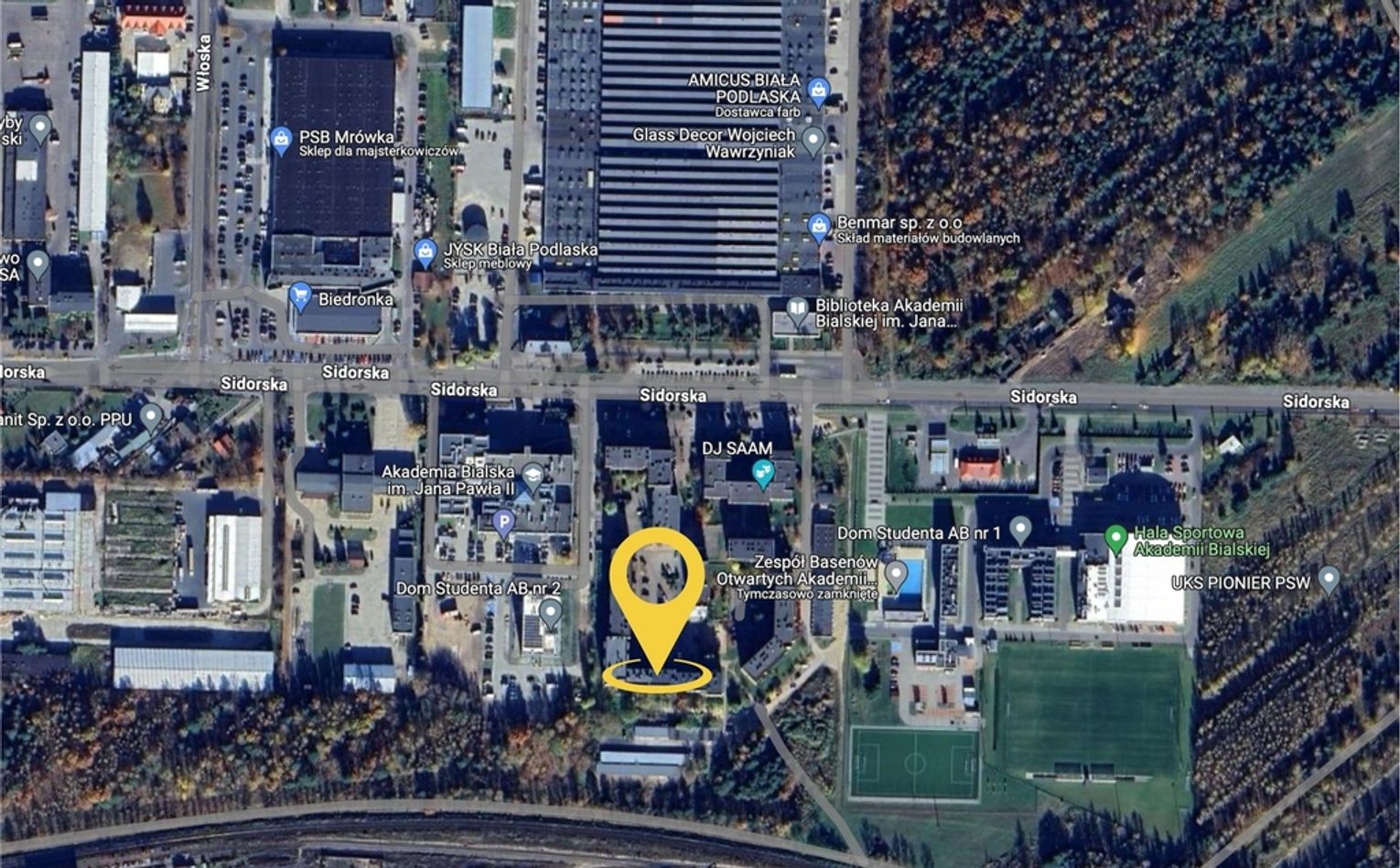 oraz uczelnię PSW, boisko i halę. Nieopodal znajduje się kościół.