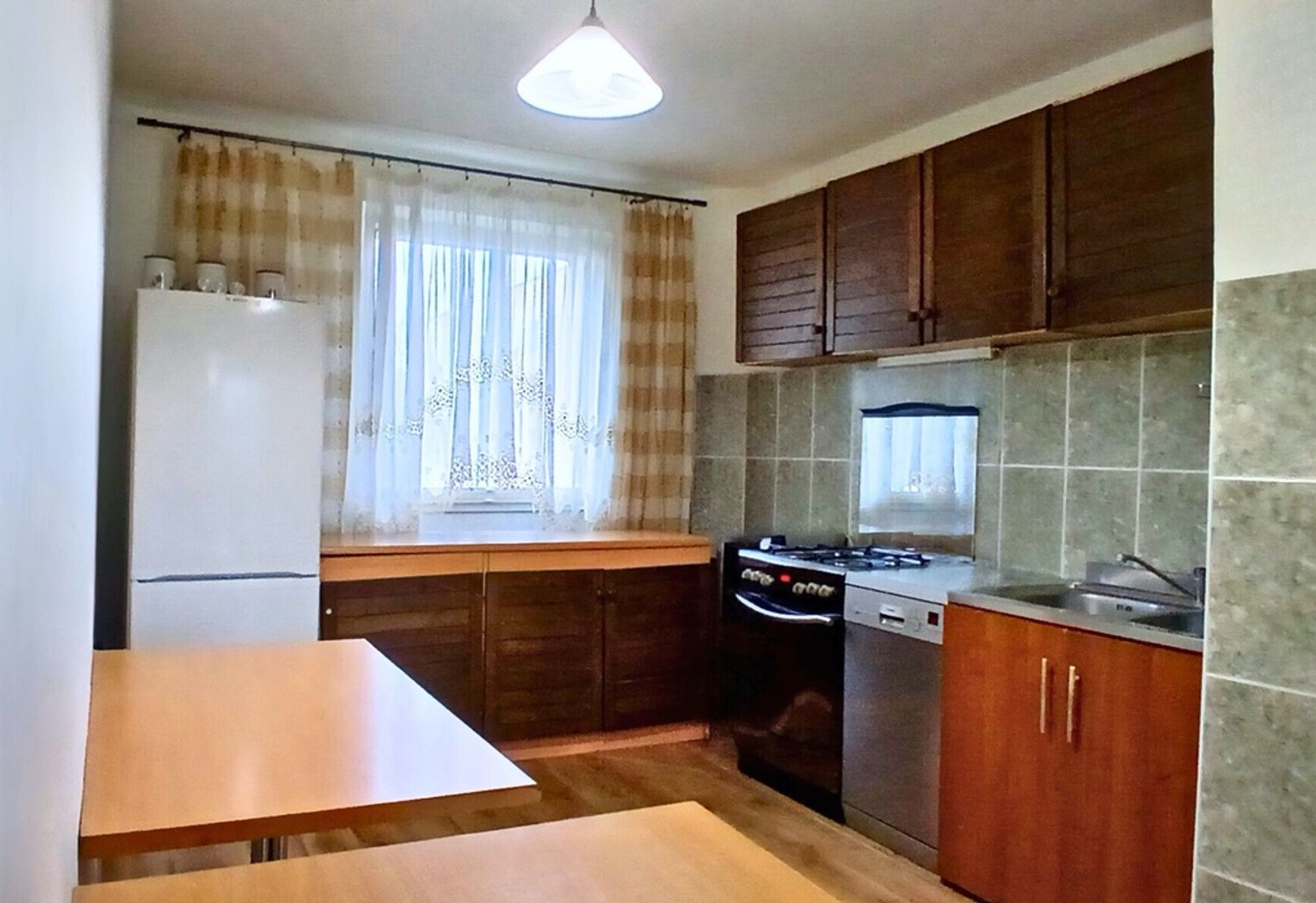Duża kuchnia. Wyposażona w kuchenkę z piekarnikiem, zmywarkę i lodówkę ma ogromny potencjał.
