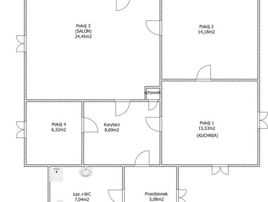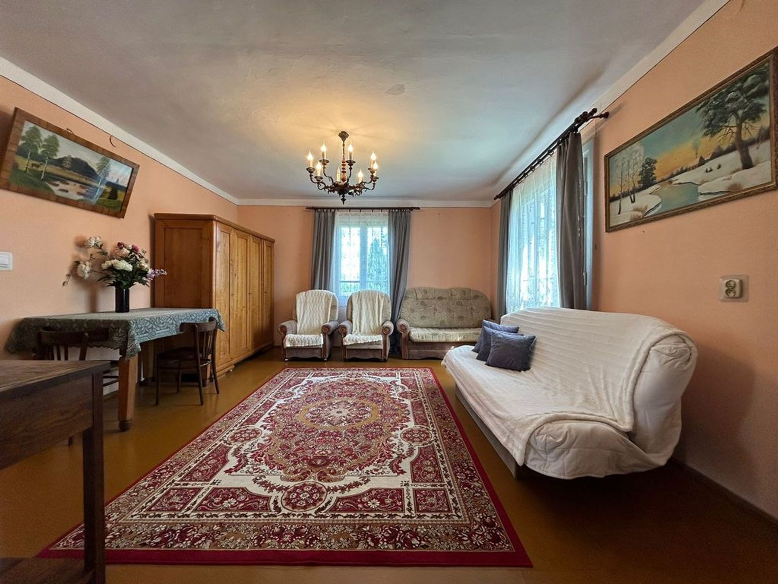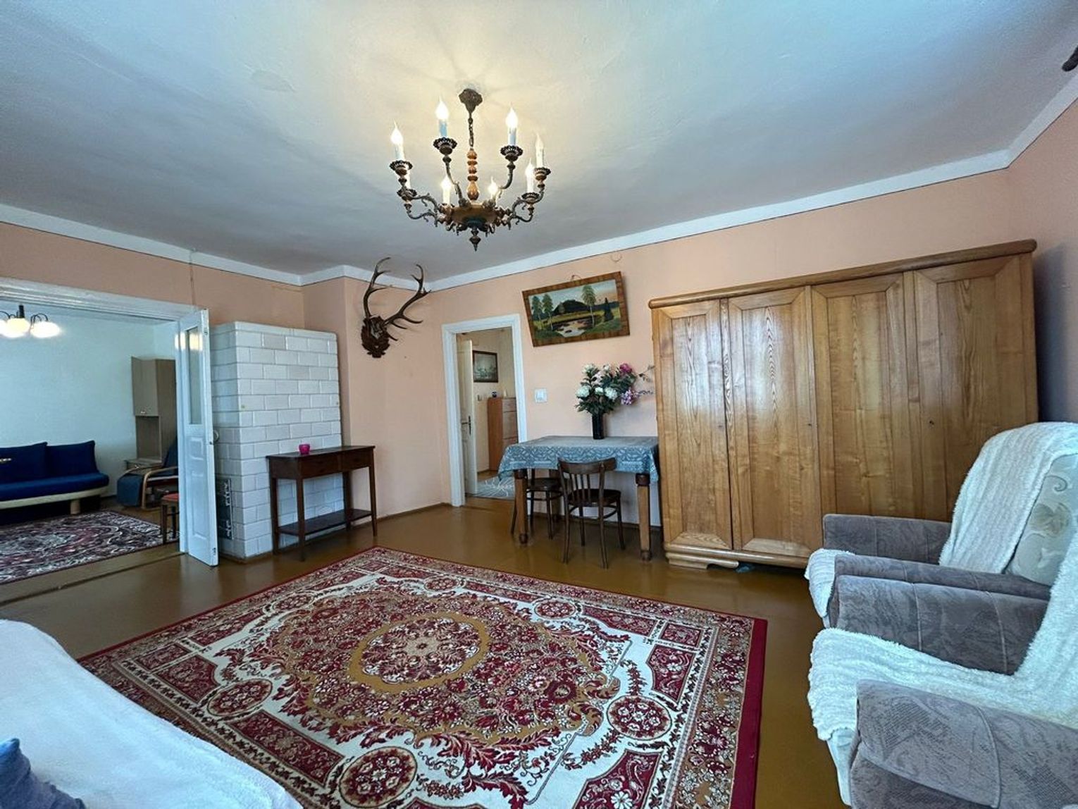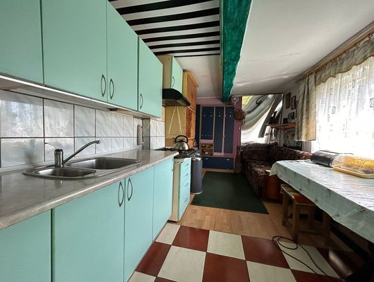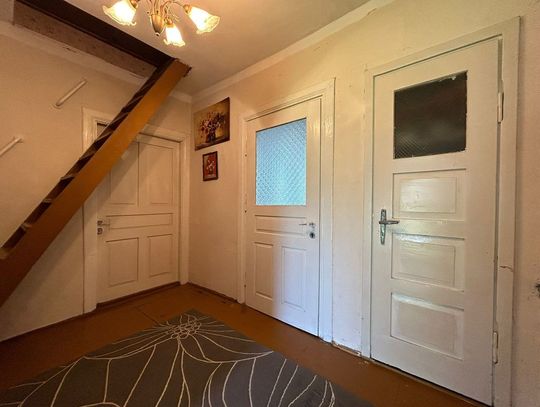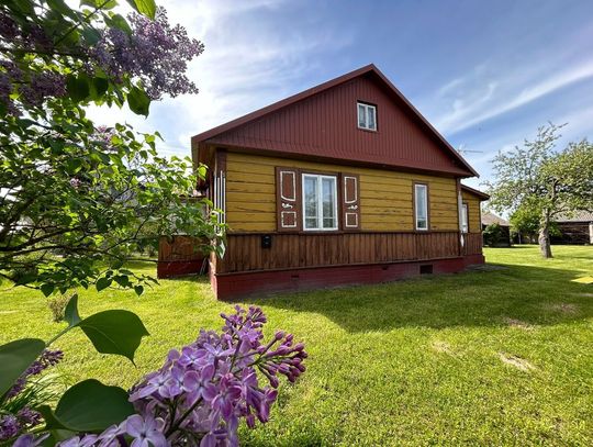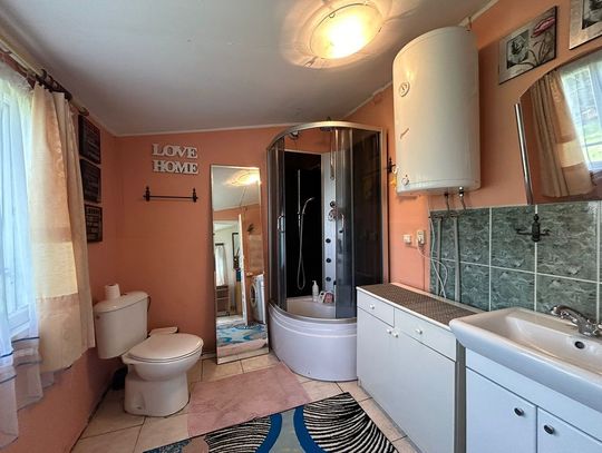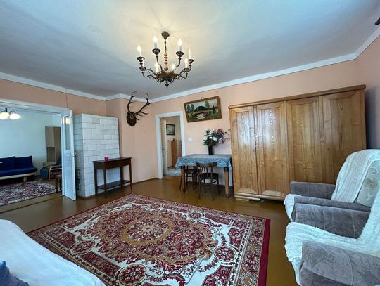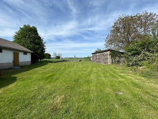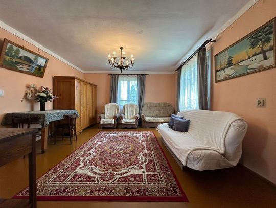 Przestronny dom z 3 sypialniami, 1 łazienką, dużym salonem i pomieszczeniami dodatkowymi, idealny dla rodziny lub osób poszukujących spokoju i przestrzeni. Jeden pokój ma możliwość przekształcenia w kuchnię. Na ten moment kuchnia znajduje się w oddzielnym budynku.