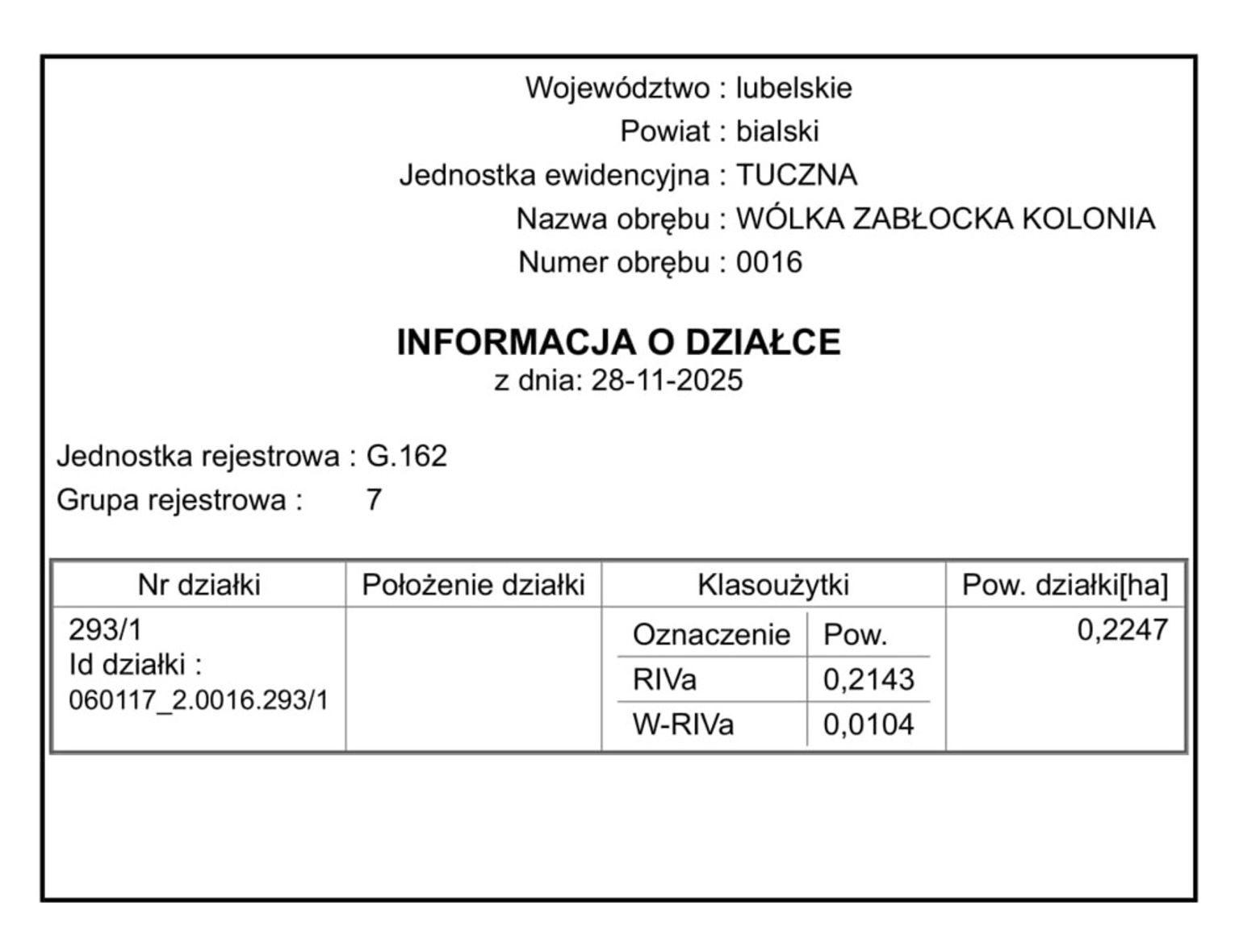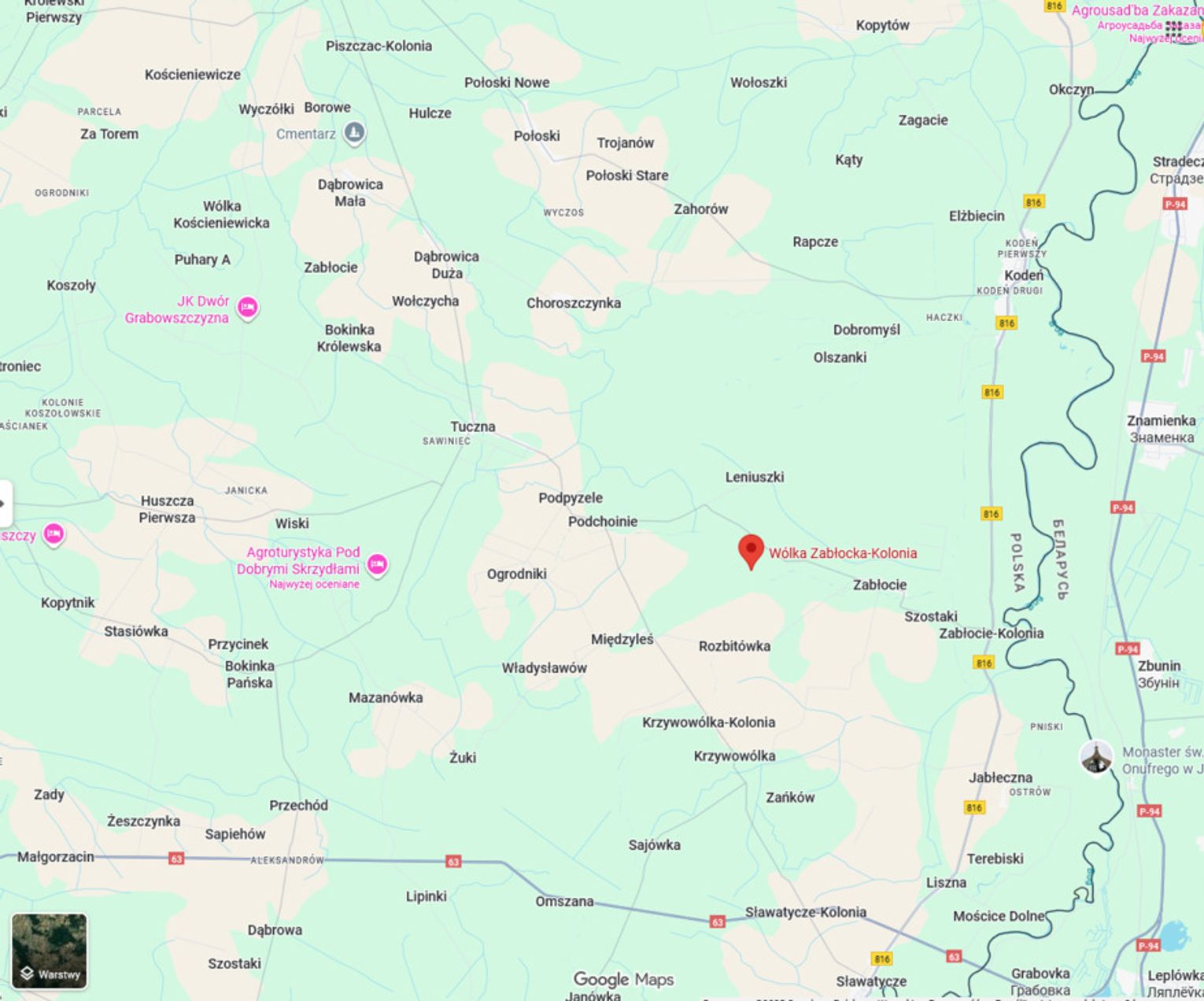 Działka jest położona w miejscowości Wólka Zabłocka Kolonia, gmina Tuczna