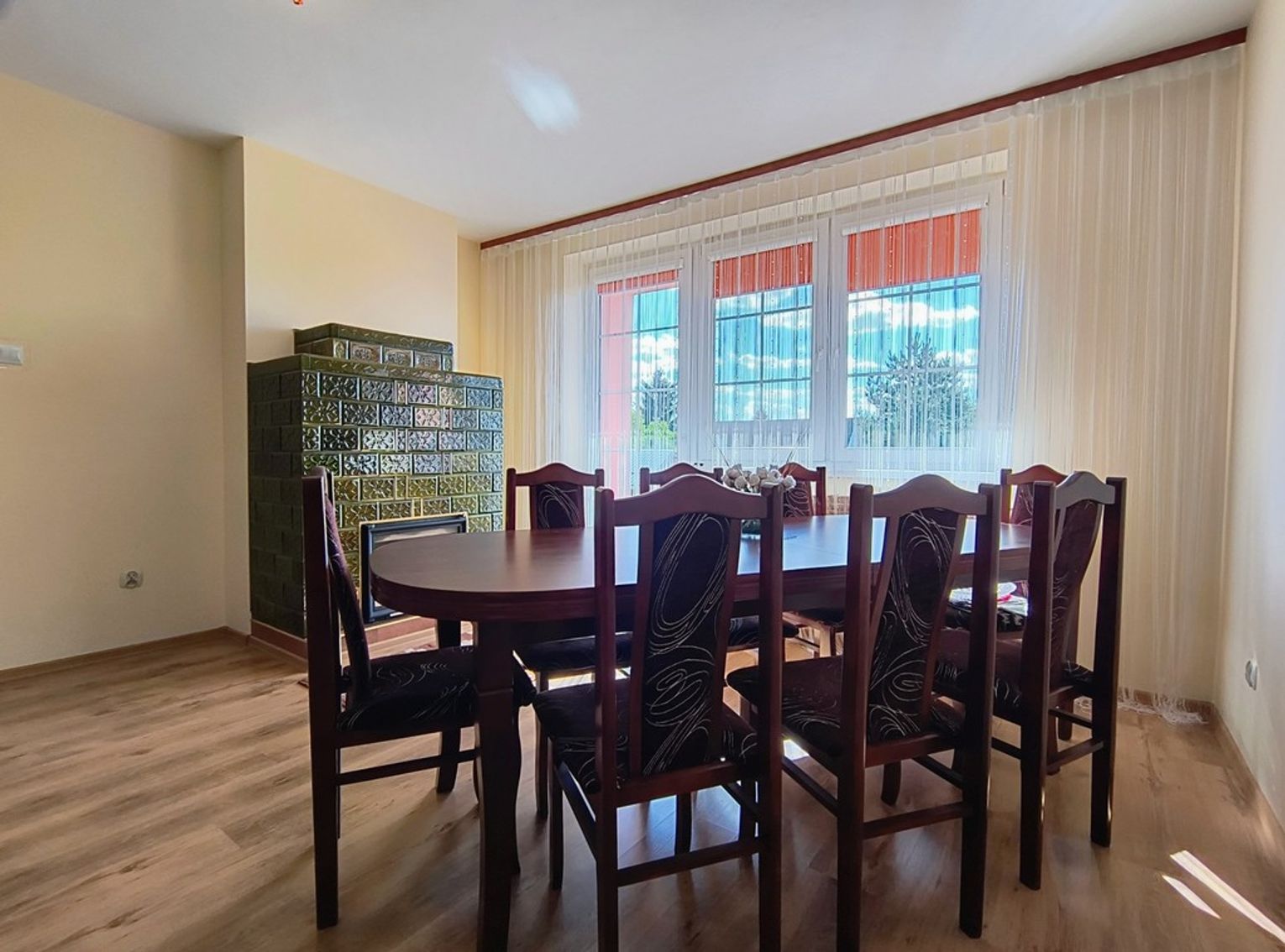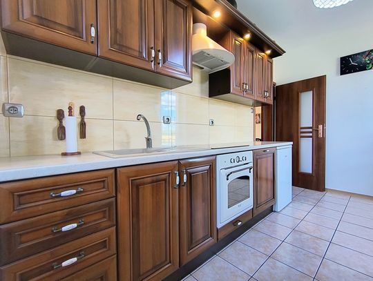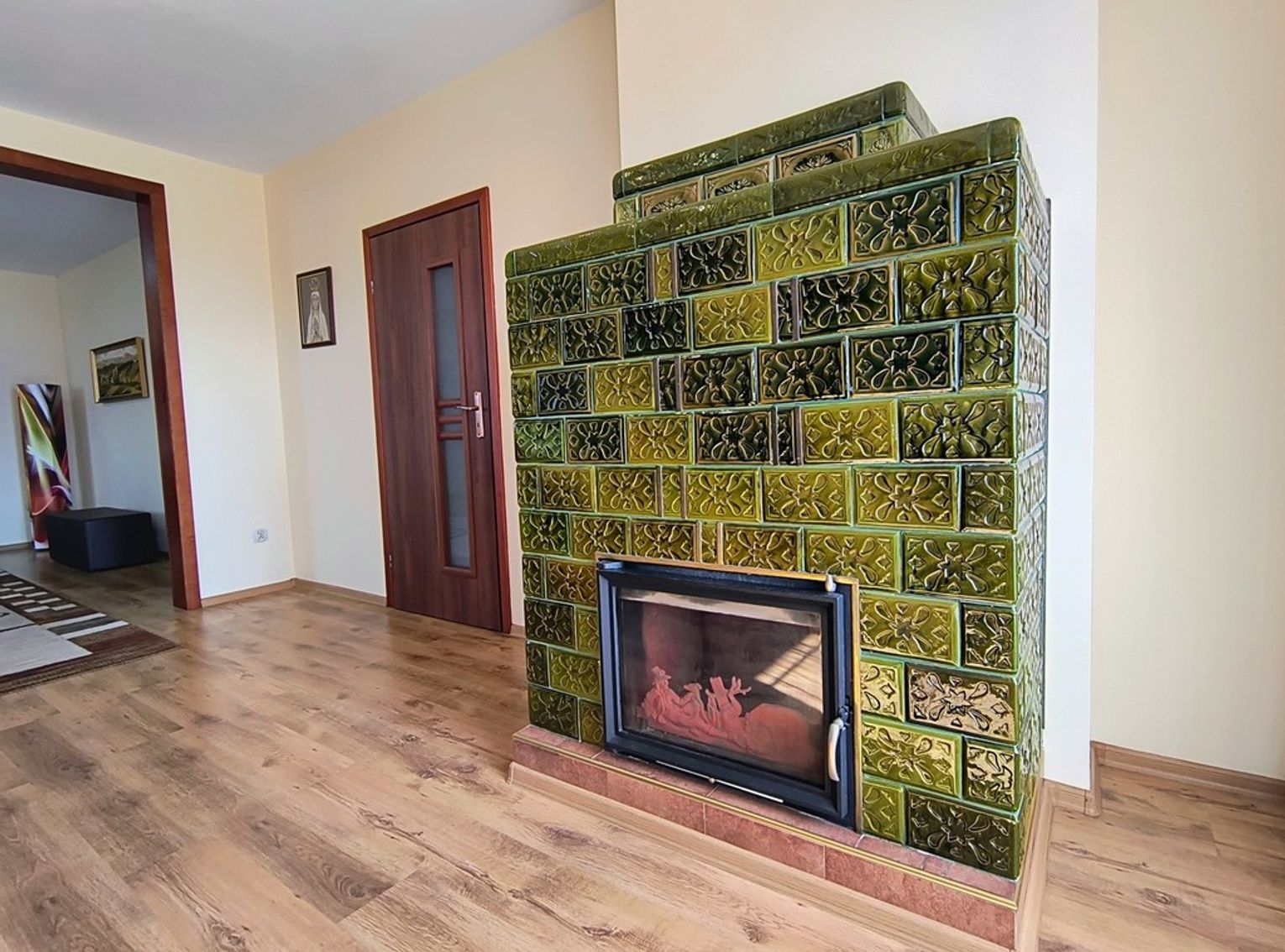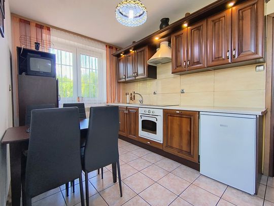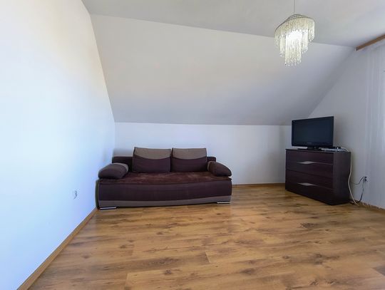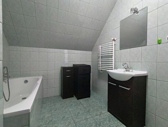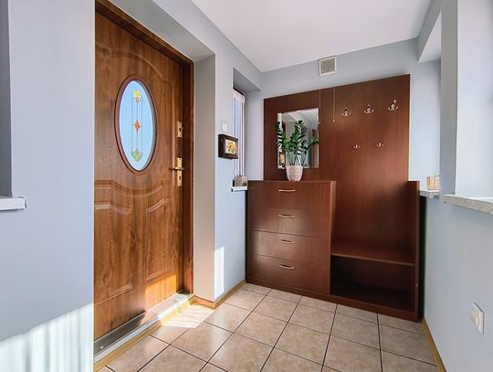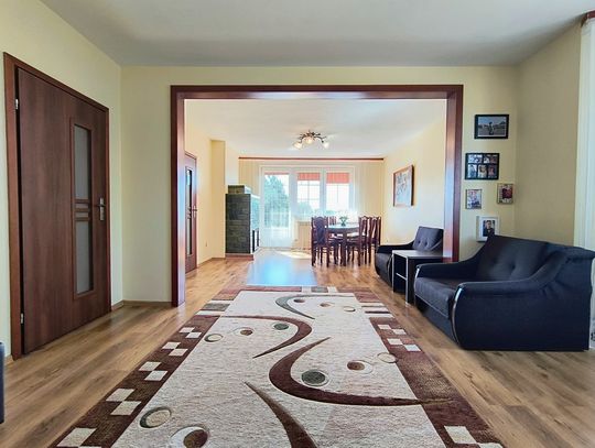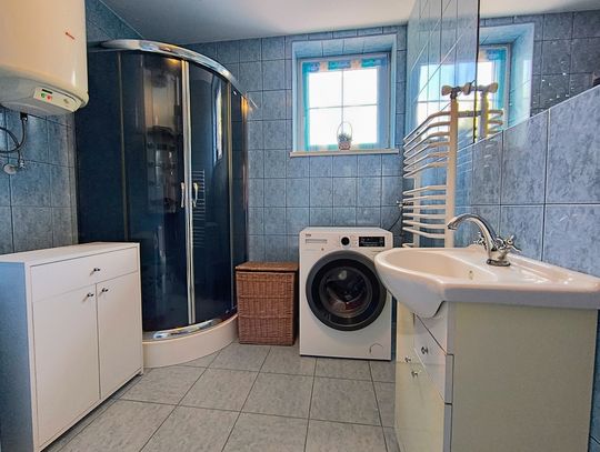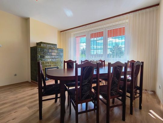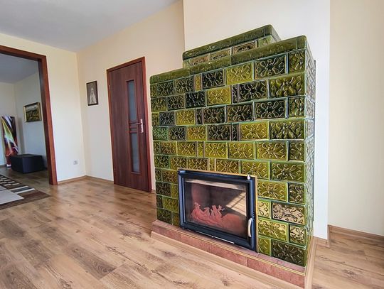 Ogrzewanie zapewnia nowoczesny piec na ekogroszek z podajnikiem, a dodatkowo w salonie znajduje się piękny kominek wykonany ze szkliwionych kafli, który dodaje wnętrzu niepowtarzalnego charakteru.