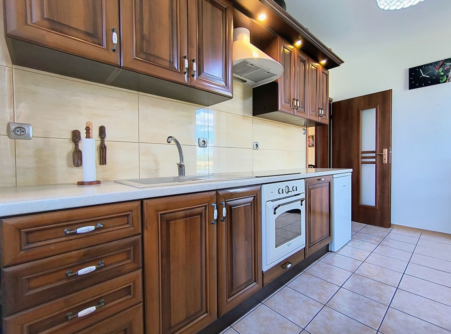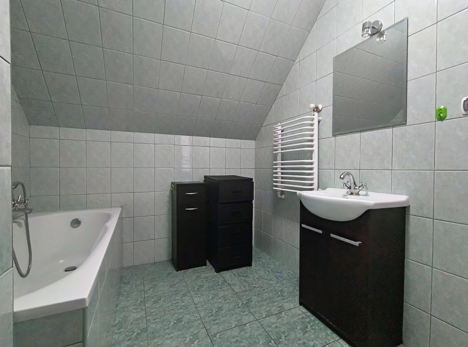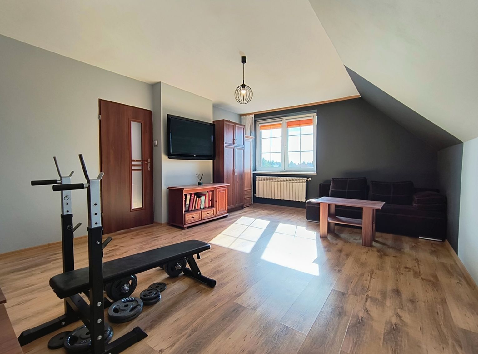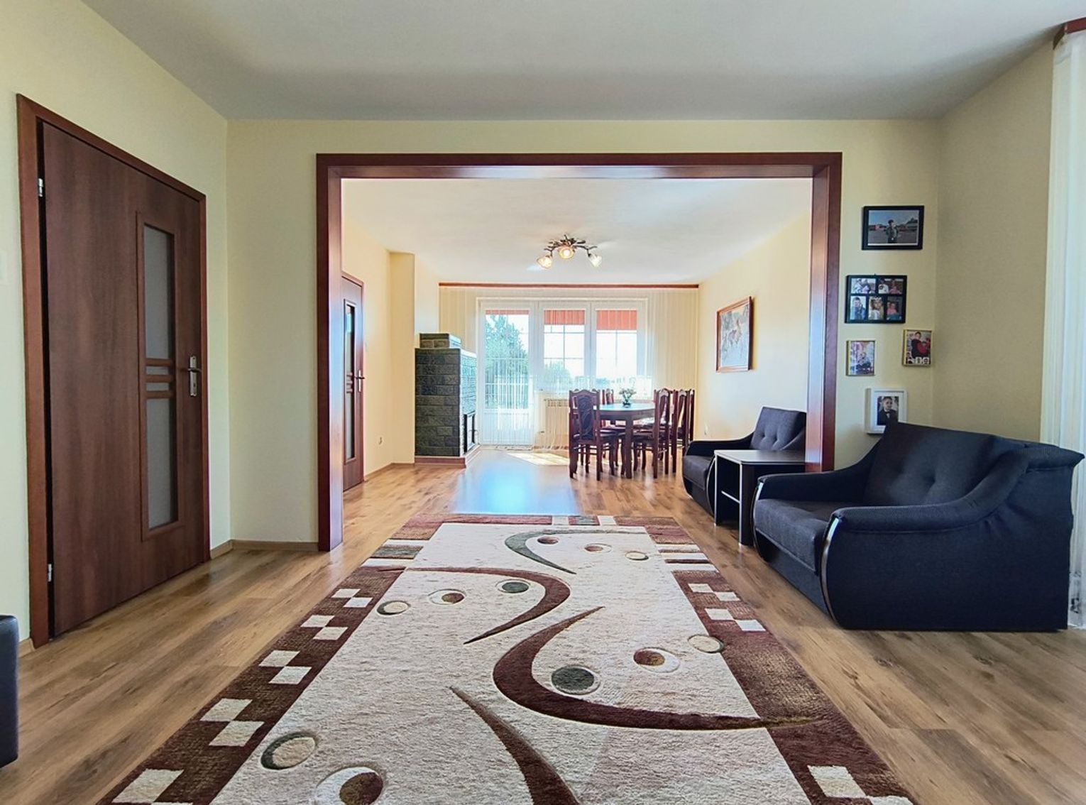 Ogrzewanie zapewnia nowoczesny piec na ekogroszek z podajnikiem, a dodatkowo w salonie znajduje się piękny kominek wykonany ze szkliwionych kafli, który dodaje wnętrzu niepowtarzalnego charakteru.