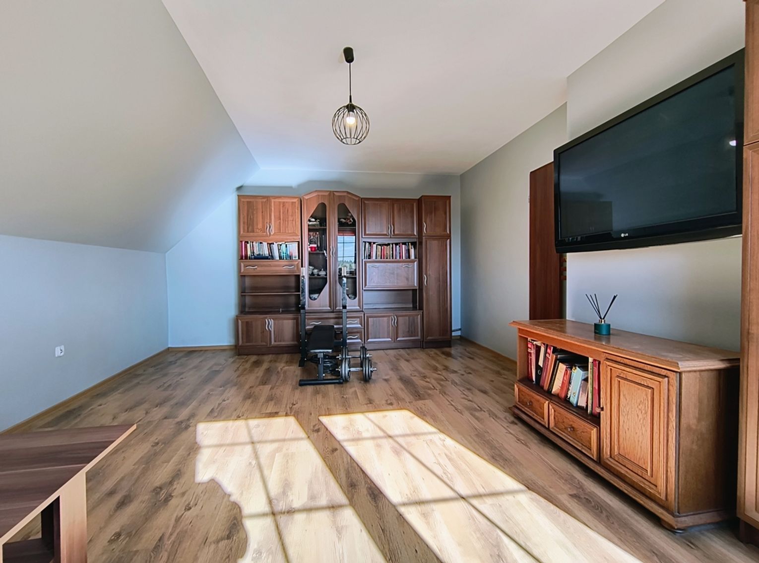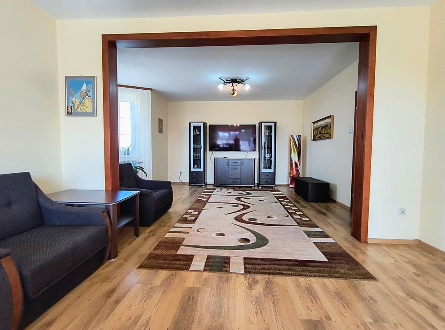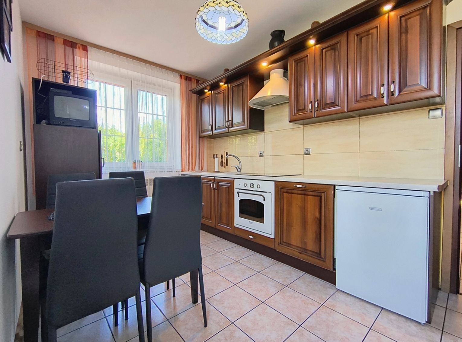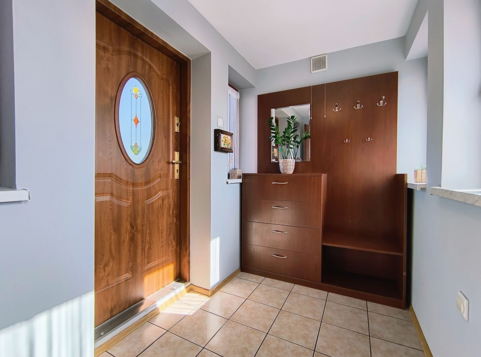 Ogrzewanie zapewnia nowoczesny piec na ekogroszek z podajnikiem, a dodatkowo w salonie znajduje się piękny kominek wykonany ze szkliwionych kafli, który dodaje wnętrzu niepowtarzalnego charakteru.