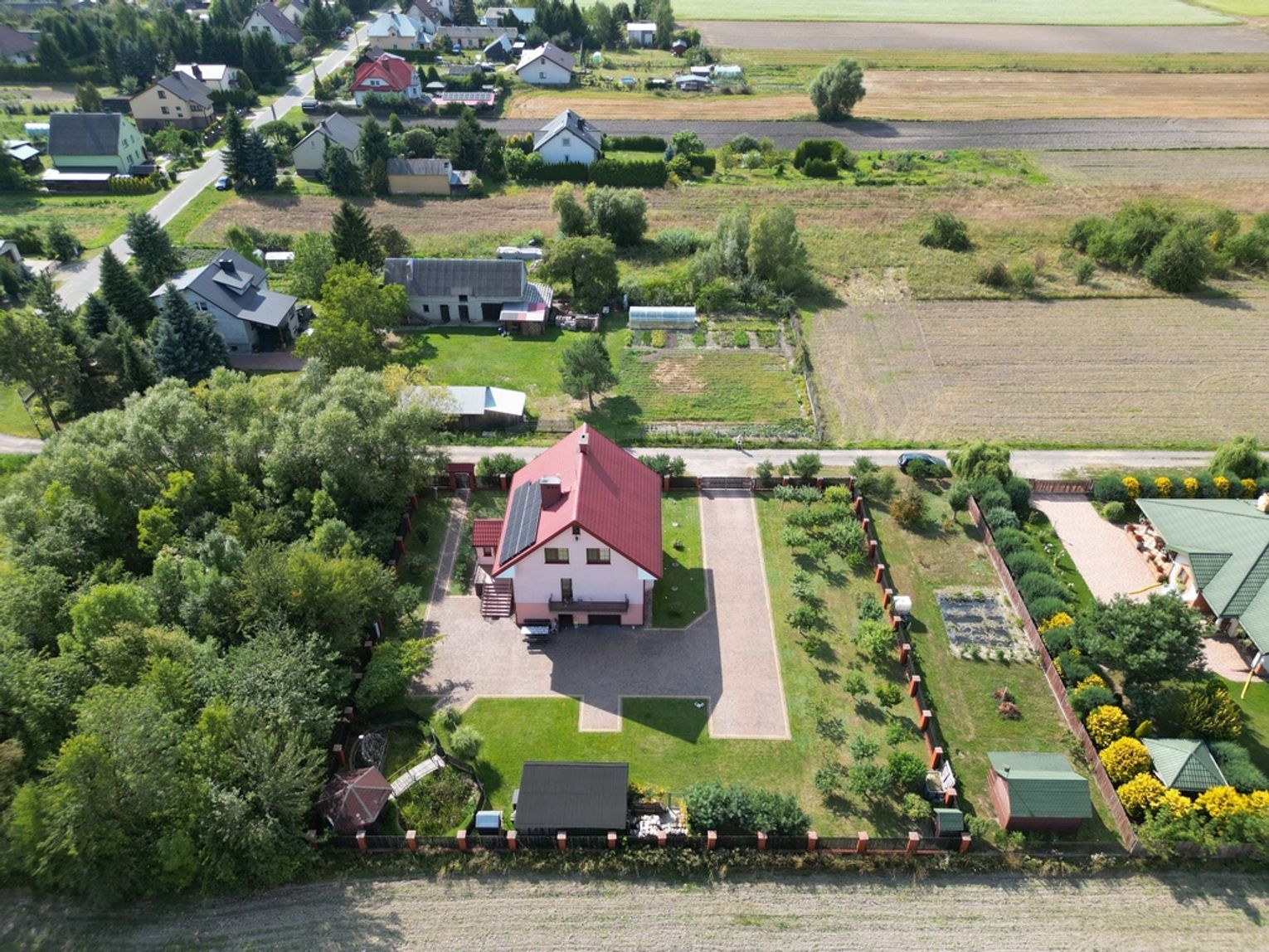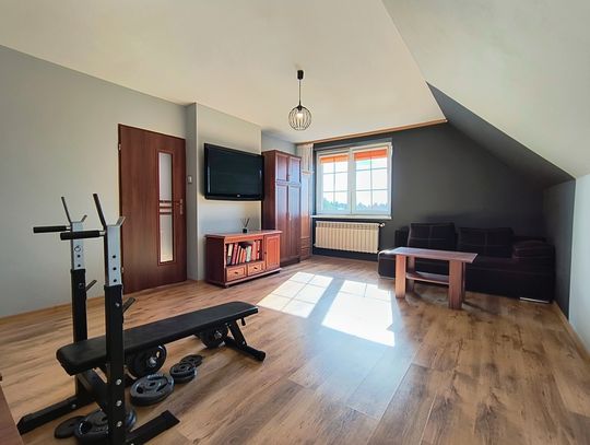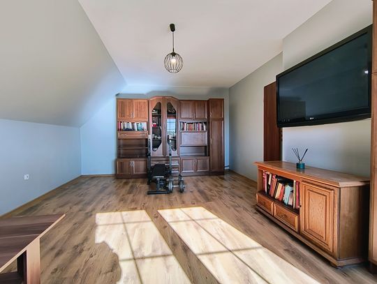 Nieruchomość posiada szereg udogodnień, w tym automatyczną bramę wjazdową, ogrodzenie z klinkieru oraz system fotowoltaiczny, co zapewnia oszczędności na kosztach energii.