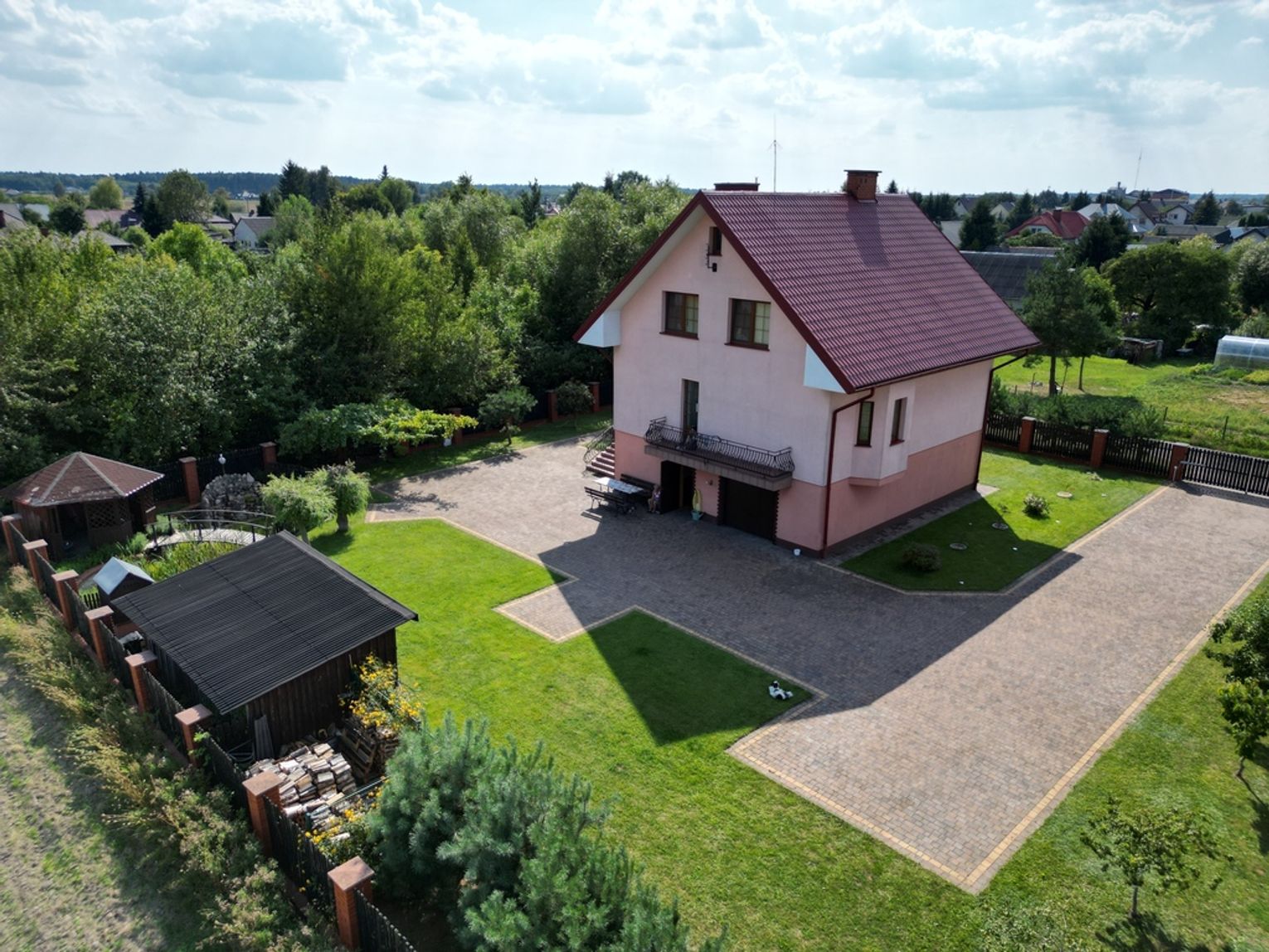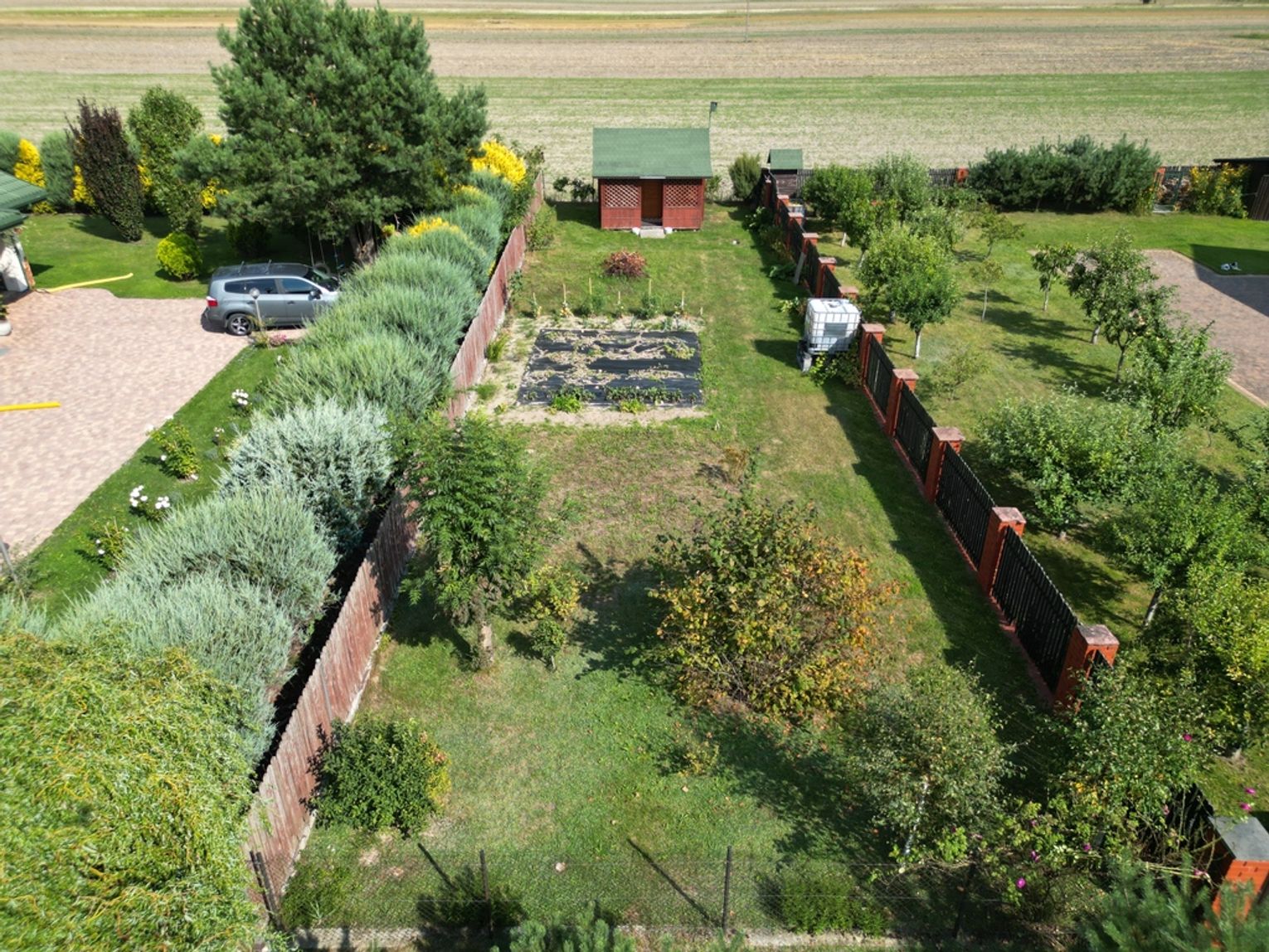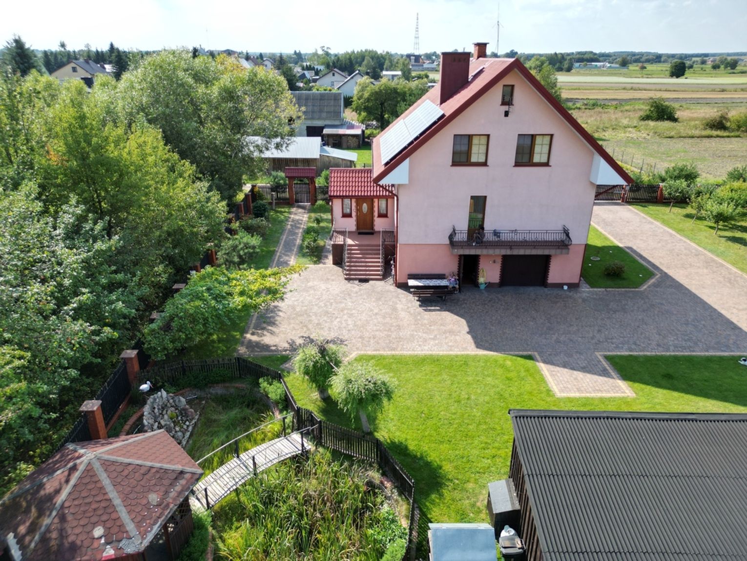 Na działce znajduje się również oczko wodne z pompą do podlewania ogrodu, co czyni pielęgnację zieleni wyjątkowo łatwą i przyjemną.