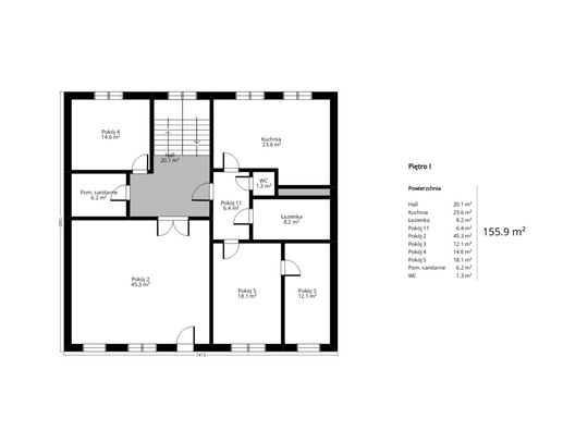 * PIĘTRO 155,9m2: (część usługowa) 2 lokale usługowe – Ubezpieczenia i Kancelaria Adwokacka oraz (część mieszkalna): kuchnia, 2 pokoje – przechodni salon i sypialnia, łazienka, WC, korytarz.