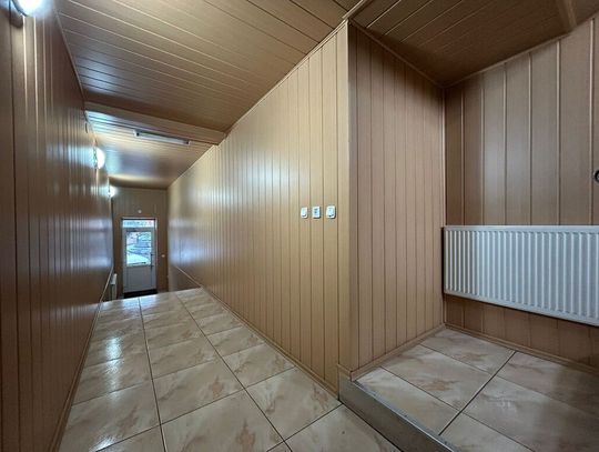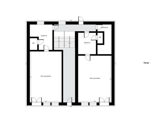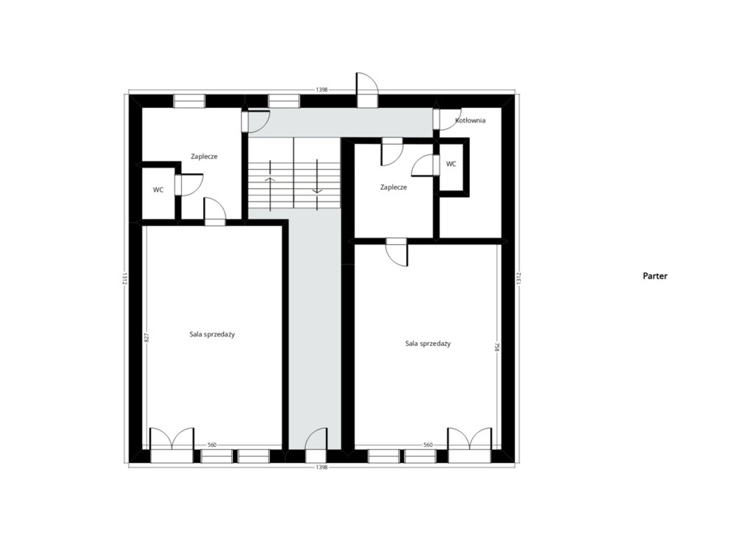 * PARTER 148,50m2: 2 sklepy z oddzielnymi zapleczami i toaletami, kotłownia. Parter posiada dodatkowe wyjście z drugiej strony budynku.
