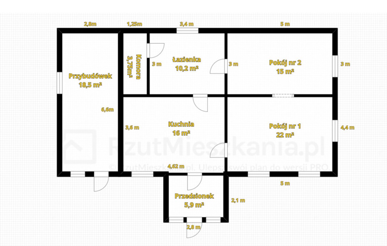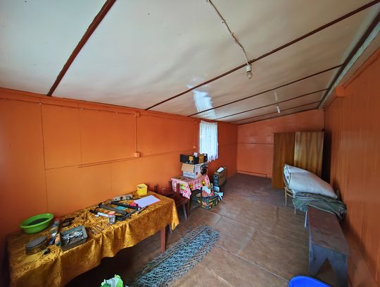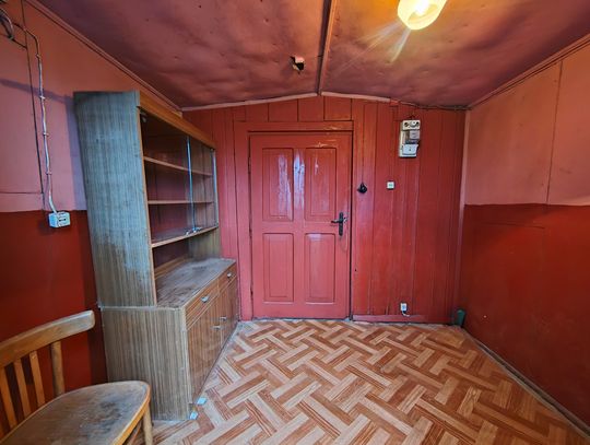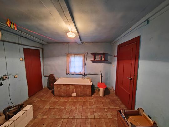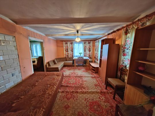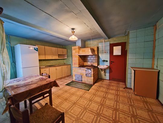 - Dom: z 1950 roku, drewniany, blaszany dach, pow. użytkowa 91 m²